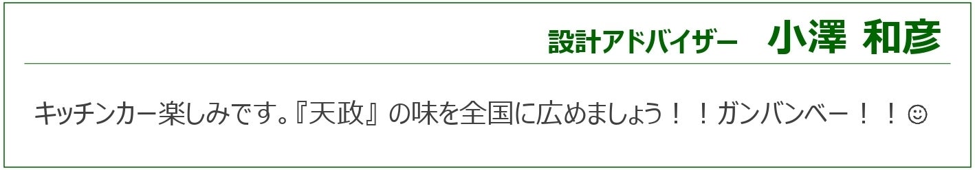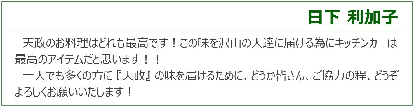 今回、より多くのお客さまに「天政の味」をお届けするため、キッチンカー導入を目指してクラウドファンディングに挑戦することにしました。どうか、みなさまのあたたかいご支援をよろしくお願いいたします。