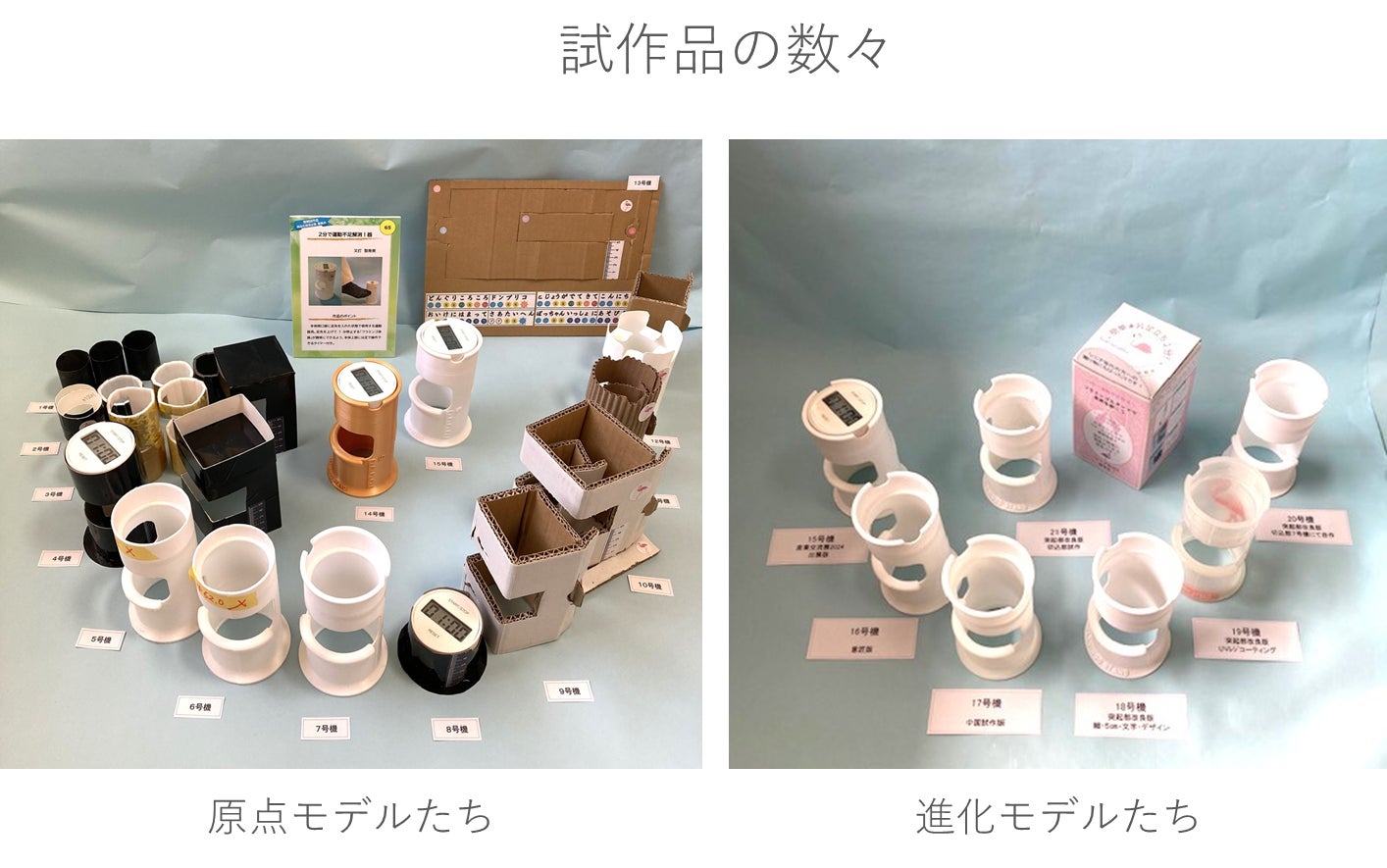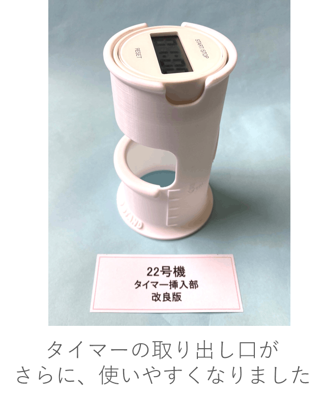 神戸発明研究会の門を叩き、先輩発明家の方々からいただいた「足を浮かすこと」というアドバイス。そして、「5cm」という高さも大切な要素だという言葉を胸に、考えに考え抜いてたどり着いたのが、このタイマー付きの形です。自分でも驚くほどの勇気と情熱で、特許申請も3回、発明学会で添削していただきながら、すべて自分で行いました。これら全てが、今の「フラミンゴスタンド」に繋がっています。
