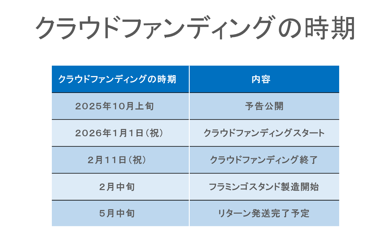 プロジェクト成功を想定し、十分な製造体制とスケジュールを整えております。しかし、予想を大きく上回るご支援をいただいた場合、製造や海外からの輸送に遅れが生じる可能性もございます。