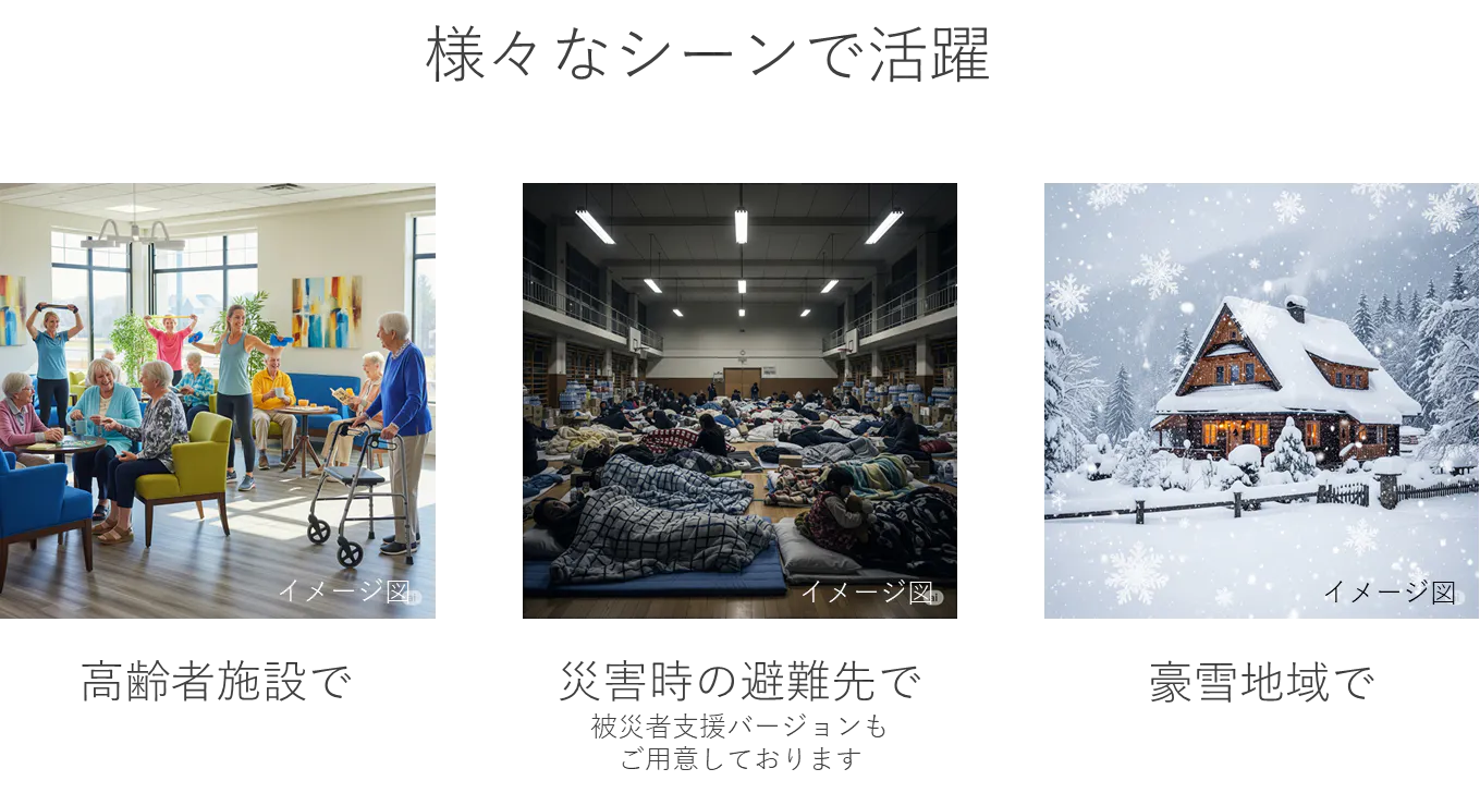 豪雪などで自宅にこもりがちな方々にも、室内で無理のない範囲で運動できる機会を提供します。若者や健常者向けではありませんが、室内での運動が中心となる方々にとって、気軽に体を動かすきっかけとなるでしょう。