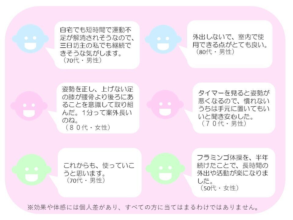 A. 私自身の経験をお話しさせてください。以前は遠出もままならなかったのですが、約1年、フラミンゴ体操を続けたおかげで、昨年開催された大規模な展示会で4日間も活動し続けることができました。同行していた妹も「こんなにタフになれるなら、私も続ける!」と驚いていました。これは継続するからこそ得られる、確かな変化だと実感しております。