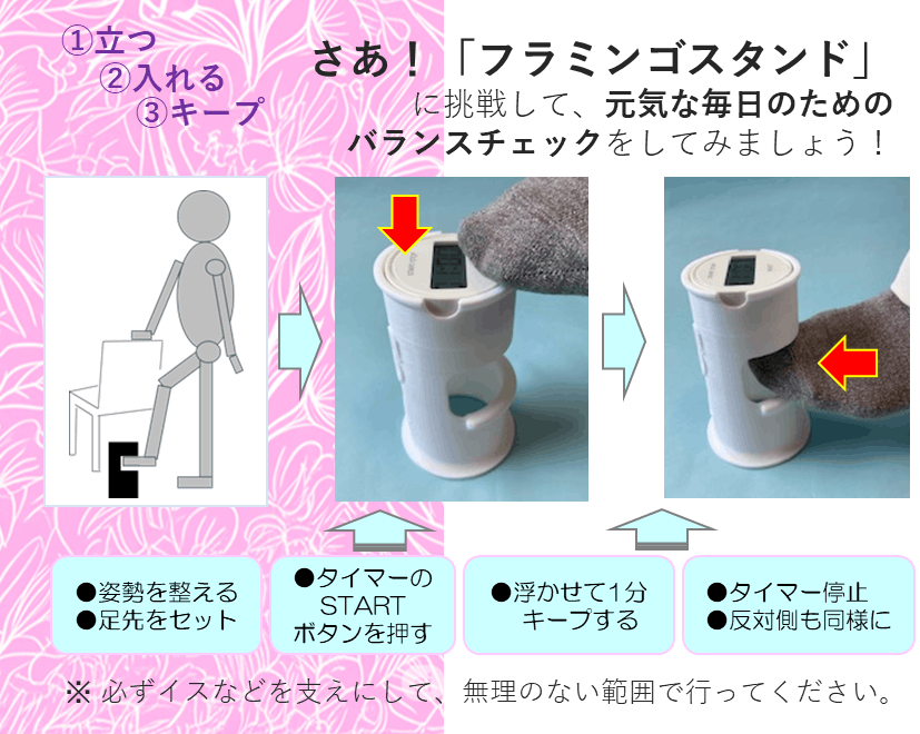 A. ダイナミックフラミンゴ体操は、股関節周りの筋力強化やバランス能力の向上が期待できます。ただし、片足立ちは股関節に体重の4倍の重さがかかると言われています。ご使用の際は、よろしければ念のためかかりつけのお医者様にご相談いただくことをおすすめいたします。
