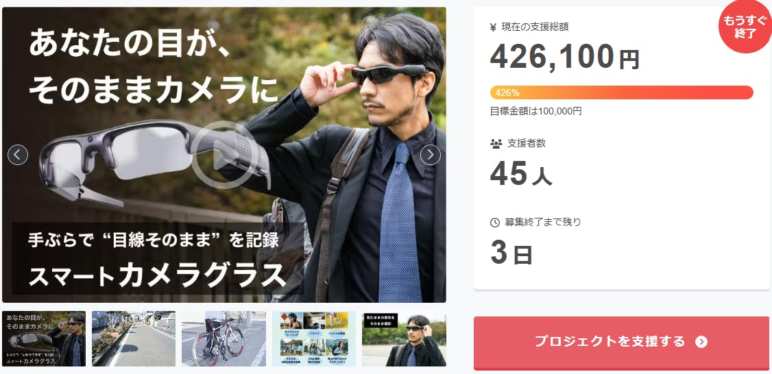 2026/01/15 12:01ご支援者様、あなたの目が、そのままカメラになる。ワンタッチで簡単録画【スマートカメラグラス】にご興味をお持ちいただきありがとうございます。お陰様で、開始から支援総額42万円達成することができました!終了までわずか 3 日となります。<手がふさがらないので、安全で快適に撮影が可能です。目線と同じ位置にカメラを搭載し、臨場感あふれる“一人称視点動画”を簡単に記録できます。サングラスとしても普段使いでき、必要な時にワンタッチで録画をスタート。日常の瞬間を自然に捉え、記録する新しい体験を提供します。>プロジェクト終了後、「あなたの目が、そのままカメラになる。ワンタッチで簡単録画【スマートカメラグラス】】」をCampfire特別価格で入手することはできなくなりますので、ご支援がまだの方、追加支援をご検討の方はお急ぎくださいますようお願い申し上げます。ご興味のある方、ぜひ支援お願い致します。https://camp-fire.jp/projects/888674/viewBrightチームは、当プロジェクトをもっと多くの方に知っていただきたいと考えております。よかったら、FacebookやTwitter等のSNSでのシェア・拡散をお願い致します。#スマートカメラグラス #brightdiyどうぞよろしくお願い致します。Brightチーム もっと見る