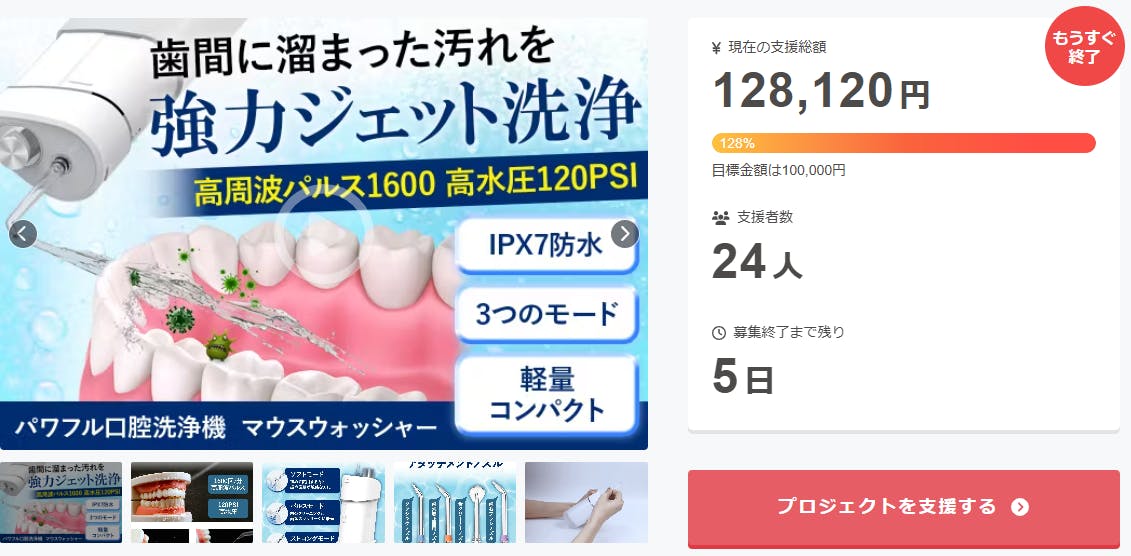 2025/12/26 12:08ご支援者様、第2弾◎ワンボタンでいつでも爽快オーラルケア!パワフル水流「マウスウォッシャー」にご興味をお持ちいただきありがとうございます。お陰様で、開始から支援総額12万円達成することができました!終了までわずか 5 日となります。プロジェクト終了後、「第2弾◎ワンボタンでいつでも爽快オーラルケア!パワフル水流「マウスウォッシャー」」をCamfire特別価格で入手することはできなくなりますので、ご支援がまだの方、追加支援 をご検討の方はお急ぎくださいますようお願い申し上げます。ご興味のある方、ぜひ支援お願い致します。https://camp-fire.jp/projects/888693/viewBrightチームは、当プロジェクトをもっと多くの方に知っていただきたいと考えております。よかったら、FacebookやTwitter等のSNSでのシェア・拡散をお願い致します。#brightdiyどうぞよろしくお願い致します。Brightチーム もっと見る