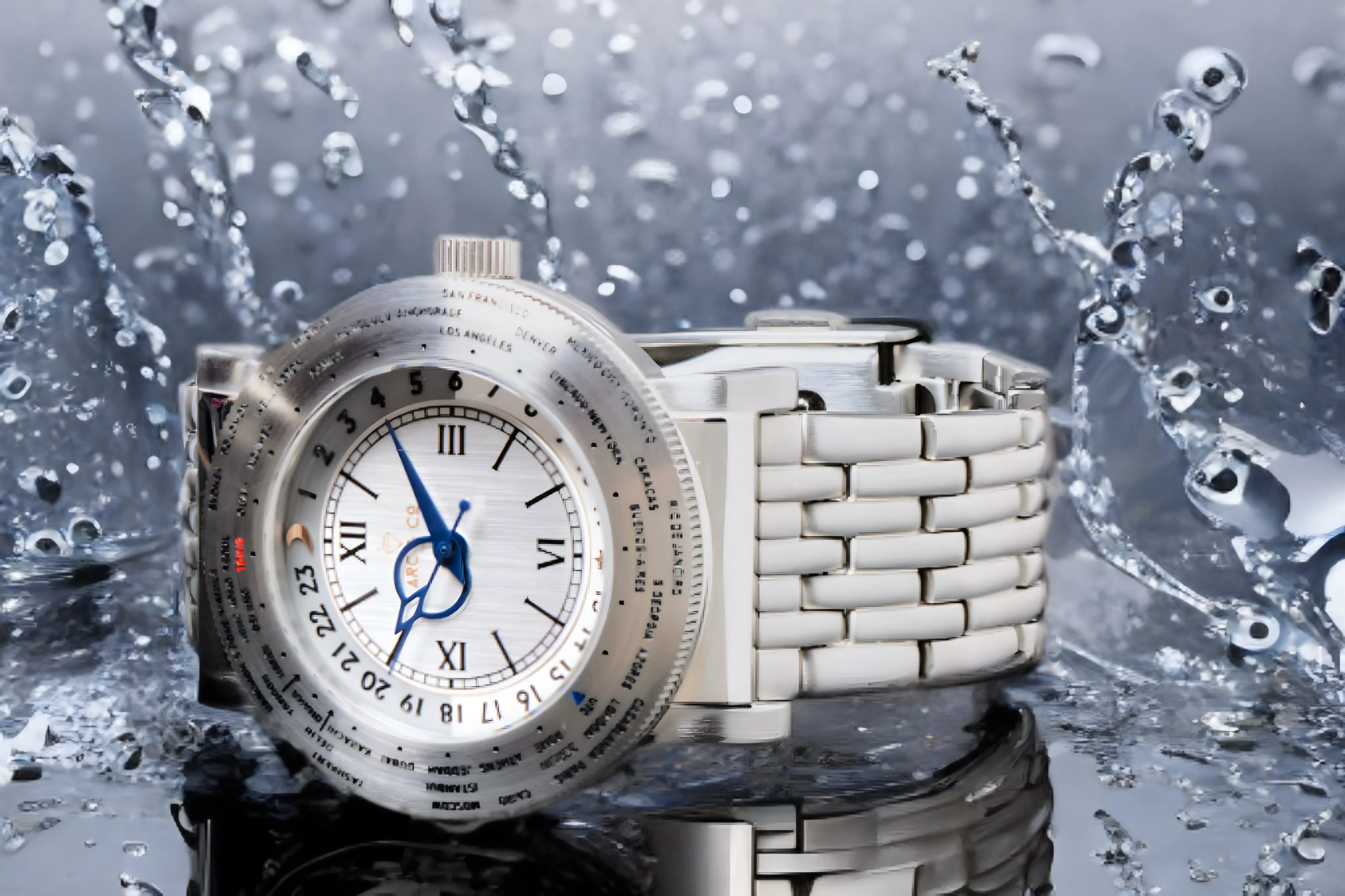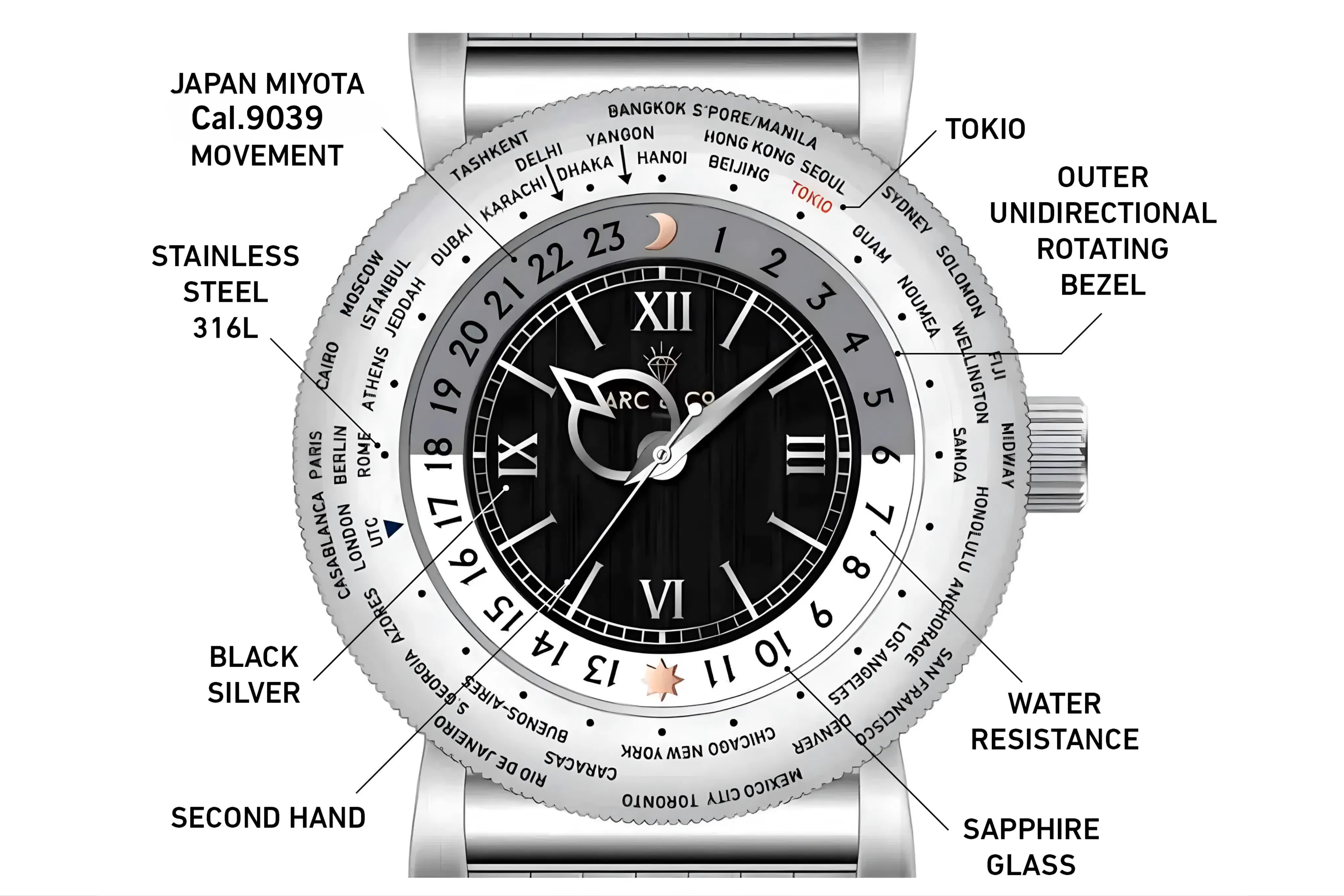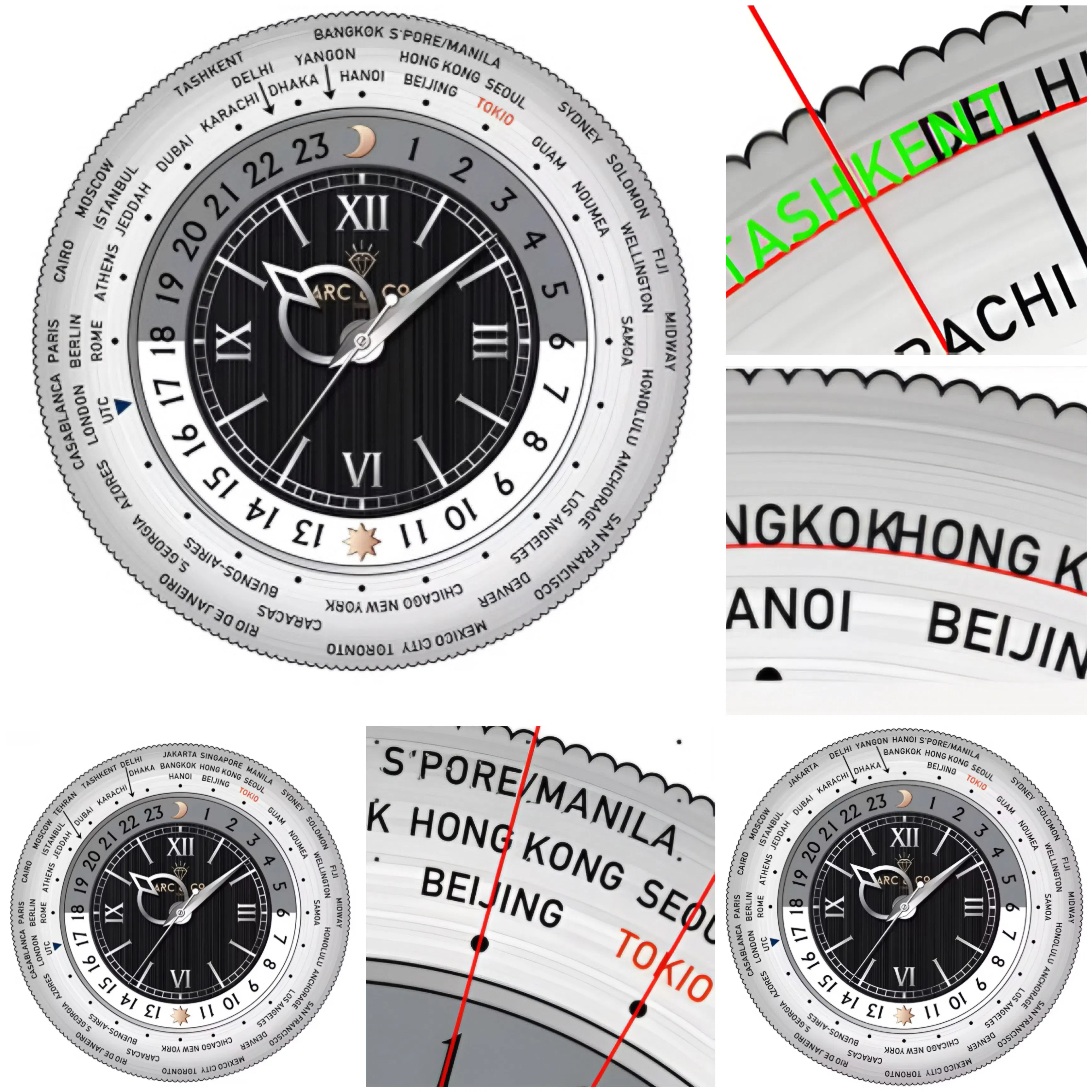 前作の31都市名を刻印したモデルは、1940年代のオリジナルモデルに記されていた都市名をほぼ忠実にベゼルに再現。当時はGreenwich Mean Time(通称GMT)と呼ばれる、英国にあるグリニッジ天文台を基準とするグリニッジ標準時しか存在しませんでした。