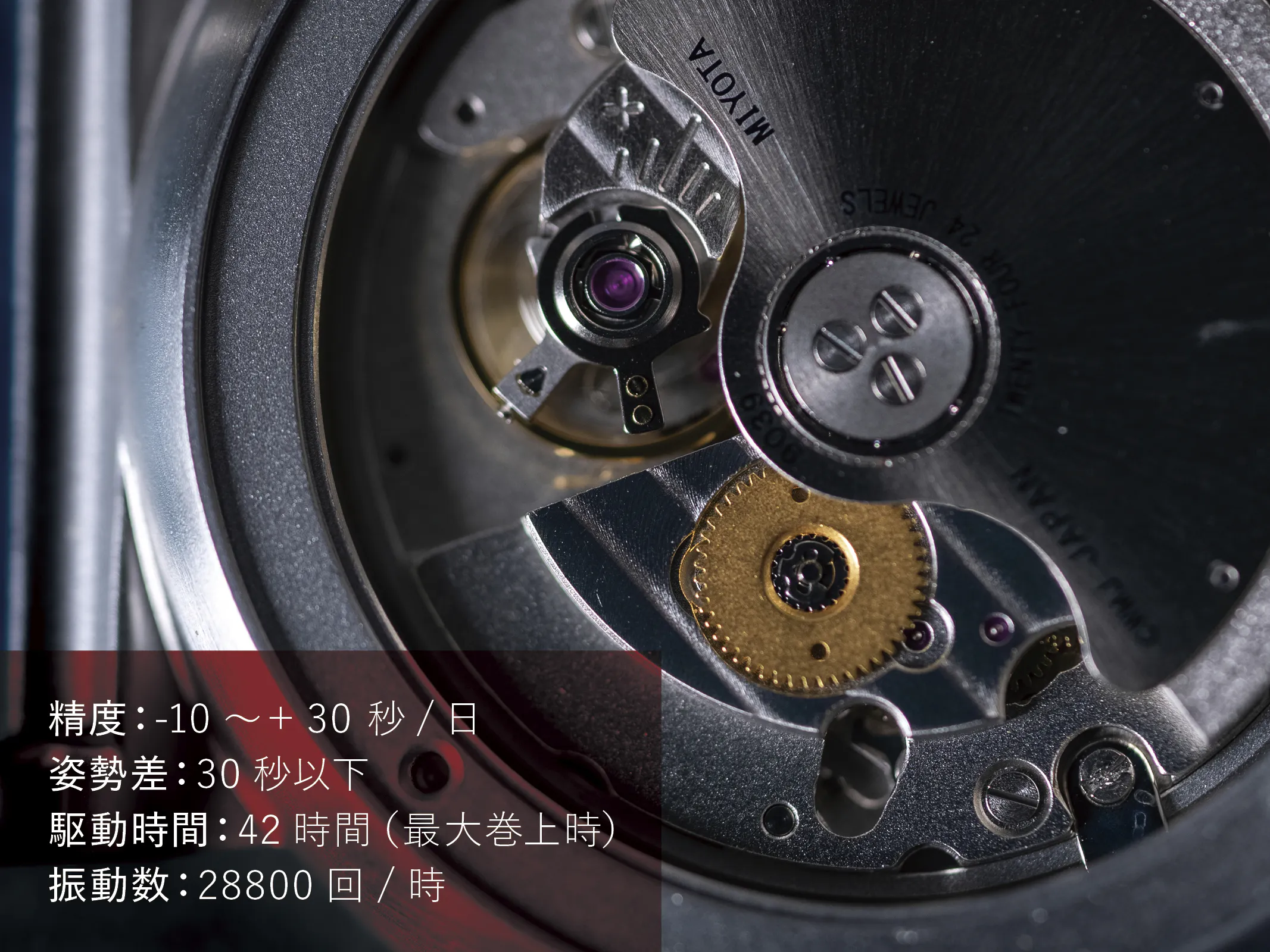 日差-10秒〜+30秒、28,800振動ハイビートによる安定した高精度を実現。