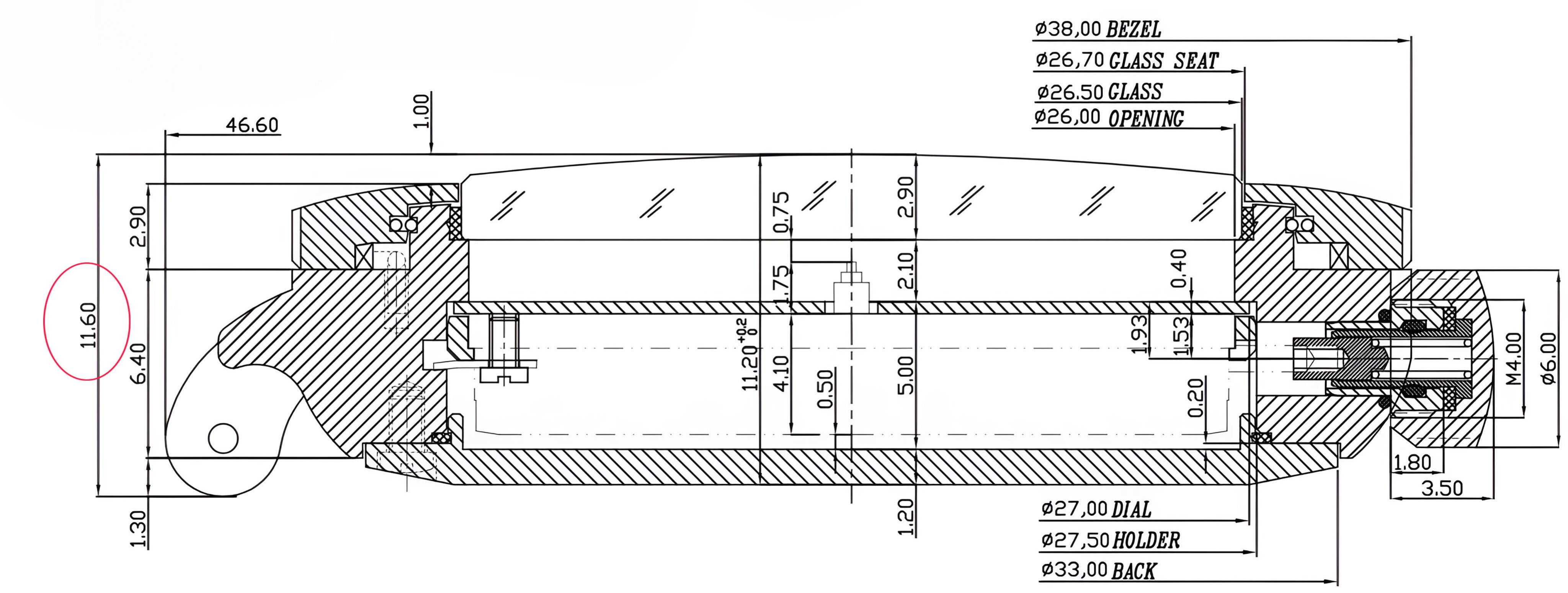 ケース径/ケース厚/ラグ幅:38.0mm/11.6mm/20mm