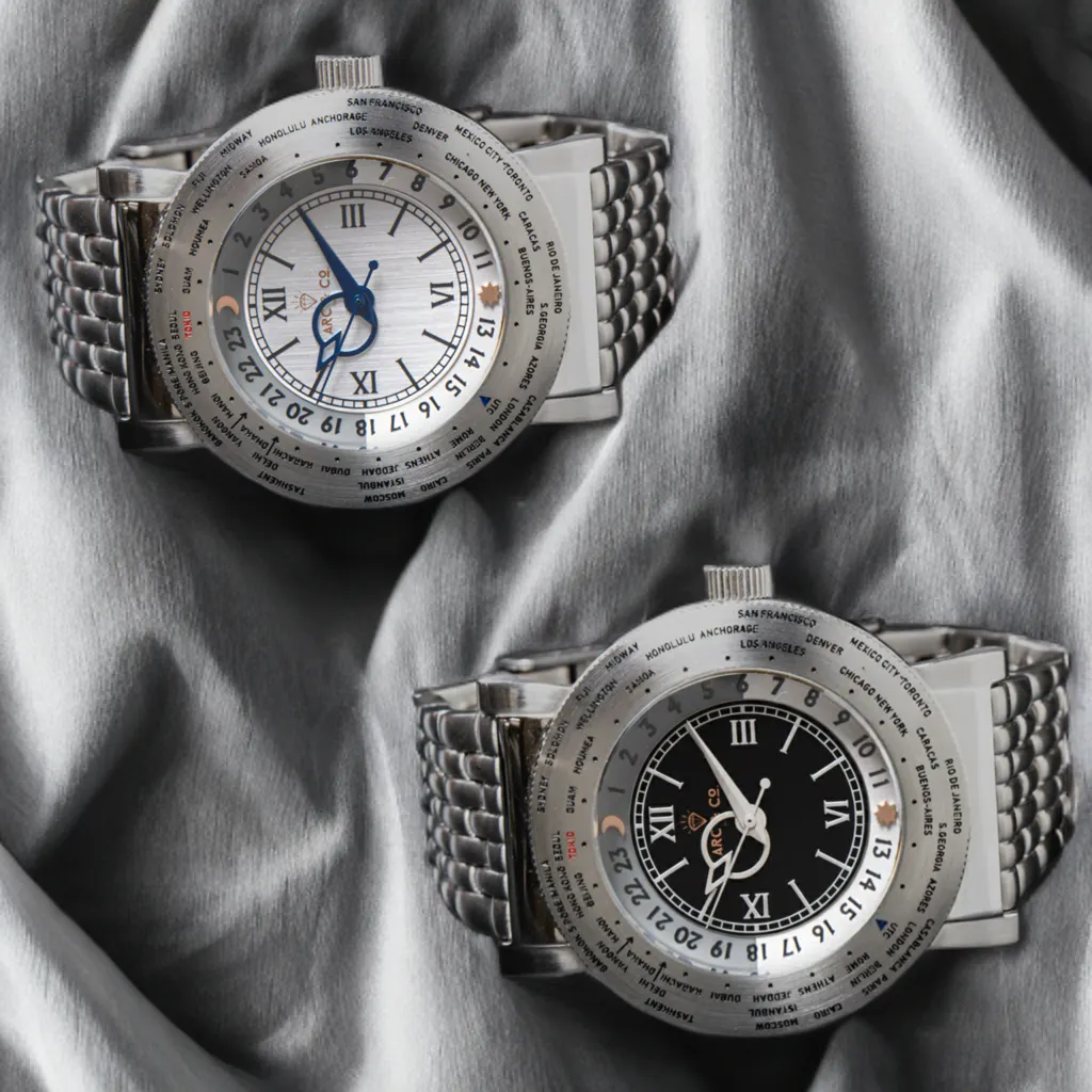 1940年代に製作されたワールドタイムウオッチの秀逸なデザインをベースに、旅行にもビジネスにも日常使いできる現代スペックにアップデートしたモデル、Modern-Vintage World Traveler を開発致しました。他人と被らない機械式腕時計を楽しんでください。