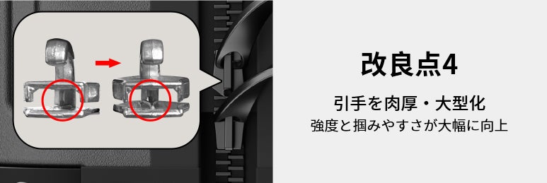 ファスナーの引手(プラー)部分の形状を一新しました。中央部分を長く、かつ肉厚に設計することで、指へのフィット感が向上。力が伝わりやすくなり、荷物をパンパンに詰めてファスナーが重くなった状態でも、指を痛めることなくスムーズに開閉が可能です。