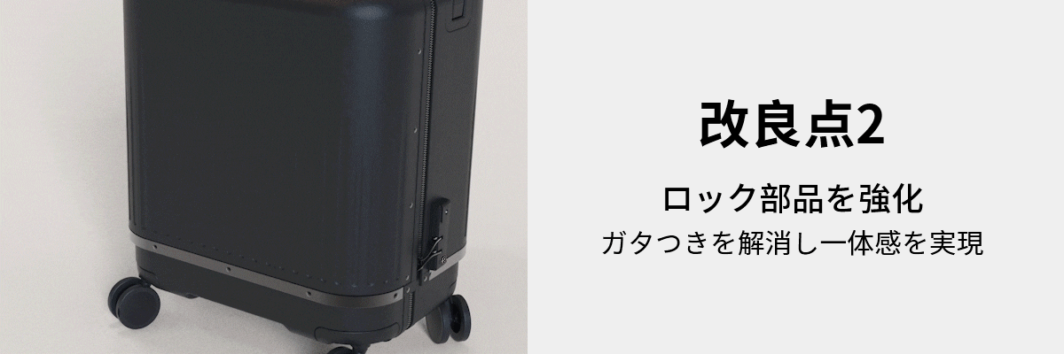 サイズ変更の要となる、スーツケース内部のロックパーツ(留め具)を新仕様に変更しました。サイズ拡張後にボディを内側からガッチリとロックすることで、可変式特有の「ズレ」や「グラつき」を防止。まるで1枚のハードケースのような、頼もしい一体感と強度を確保しています。