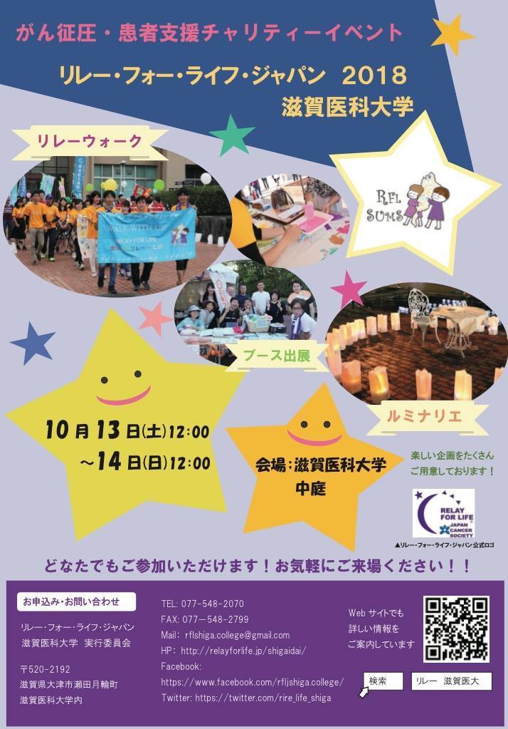 リレー・フォー・ライフ(RFL)とは、地域全体でがんと向き合い、がん患者さんを支え、がん征圧を目指すチャリティーイベントです。1985年、アメリカの1人の医師が24時間走り続け、がん患者支援への寄付を募ったことから始まりました。リレー・フォーライフ・ジャパン滋賀医科大学(RFLJ滋賀医大)は学生が主体となって運営する日本で唯一のカレッジリレーであり、今年度で3年目を迎えます。2017年度には総歩行距離2343.75km, なんとびわ湖11.7周分歩きました。リレーウォーク以外にも当日はパネルディスカッションや歌のステージ、検診、チャリティーブース・模擬店出展、ルミナリエセレモニーが行われます。今年度の開催は10/13(土)~10/14(日)です。
