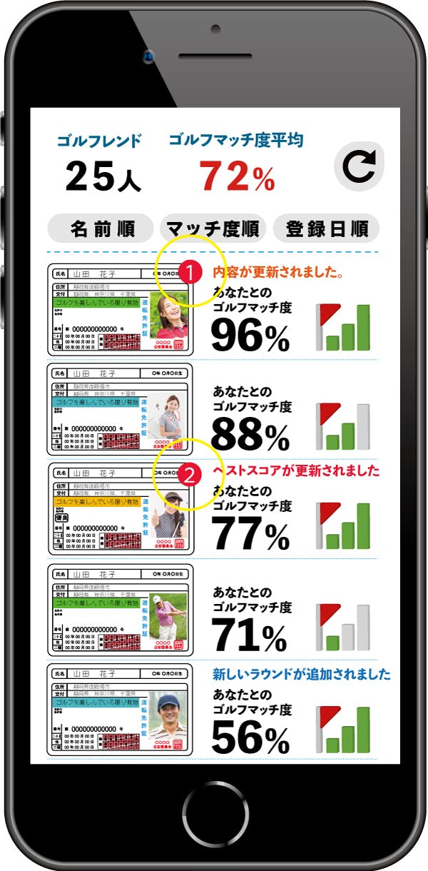 ゴルフレンドのスコアや記録が更新されて、