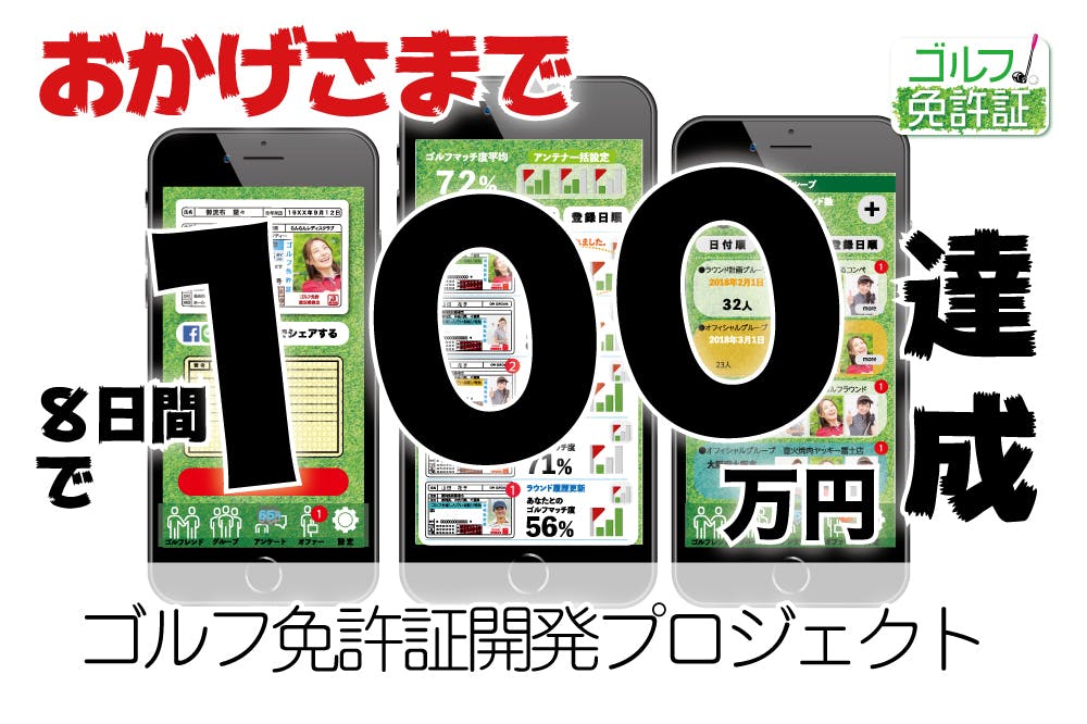2018/10/23 20:17支援された方々へ おかげさまで開始から8日目で100万円突破しました!!ありがとうございます。 ここから支援額がぐっと伸びていくといいのですが、支援される対象がゴルファーのみなので、一般の方全般が対象の多くのクラファンと異なり当初からの見立て通りでしたが、少し苦戦しています。つまり「なかなかゴルファーに情報が届かない」のです。 ゴルファーだけに、この情報を広げるには、やはりゴルファーの皆さんのWEBを通じた口コミが必要です。皆さんからの勧めで周辺にいらっしゃるゴルファーが支援してくれたら、なんて期待しています。ともかく、この時点で100万円達成できたのは今後のモチベーションとなり、チカラになります。ありがとうございました。 もっと見る