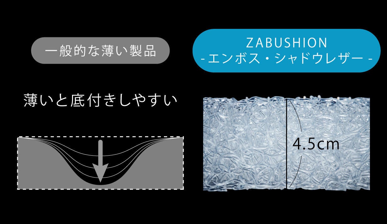 「ZABUSHION -エンボス・シャドウレザー-」 は、日本の工場で約80,000回の圧縮試験を実施し、クッション性が確認されたファイバー素材を使用しています。