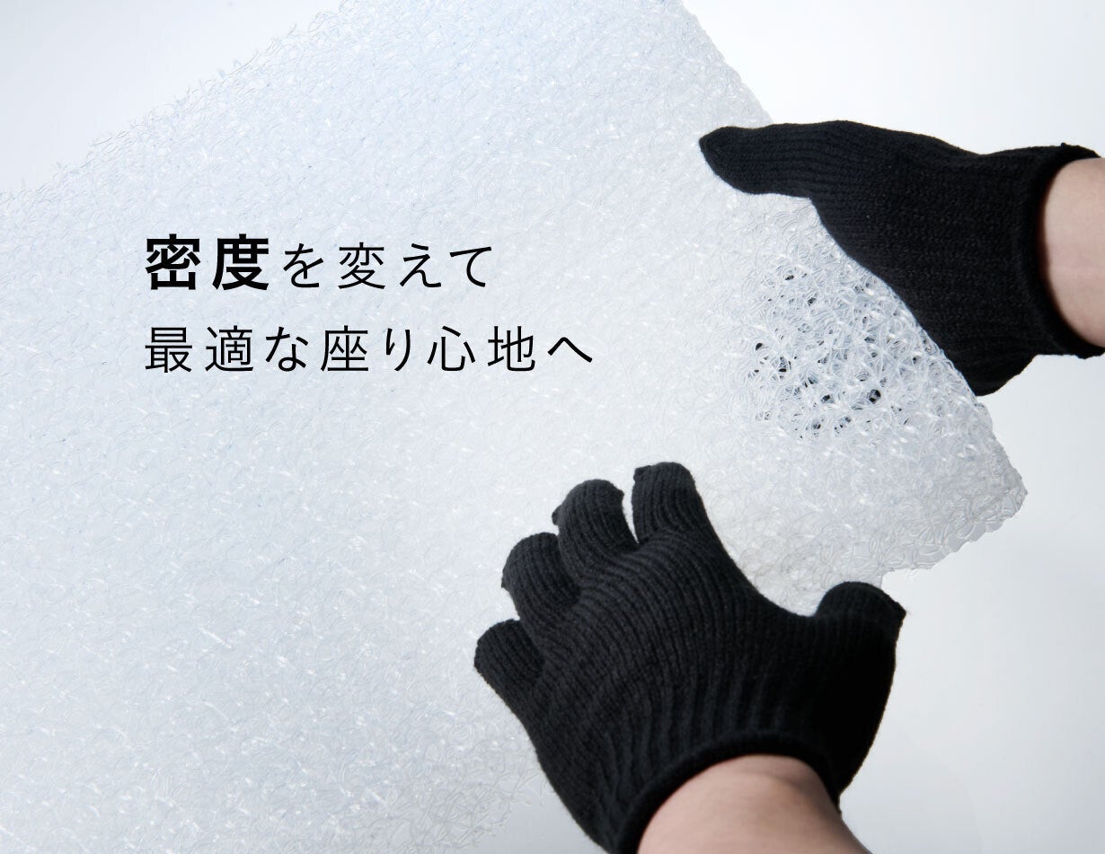 高弾力のチューブ状繊維を空気を含ませるように三次元に絡ませることで、あらゆる方向からお尻を支え、体圧を全方位均等に分散します。