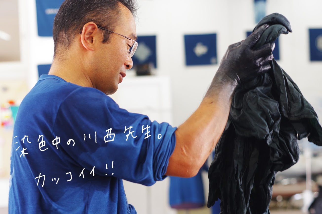 川西先生はご自身が苛性ソーダ入りの藍甕(科学的なものを混ぜ、早く簡単に染める手法があります)に手を入れてしまい、手中に疱疹が出来てしまった経験から、生徒には本物を伝えようという一心で、今回ワンピースを染めていただく本藍矢野工場の矢野さんのところに放課後や休日に通いつめたり、たくさんの協力を得ながら、何年もかけてこの環境を作られました。