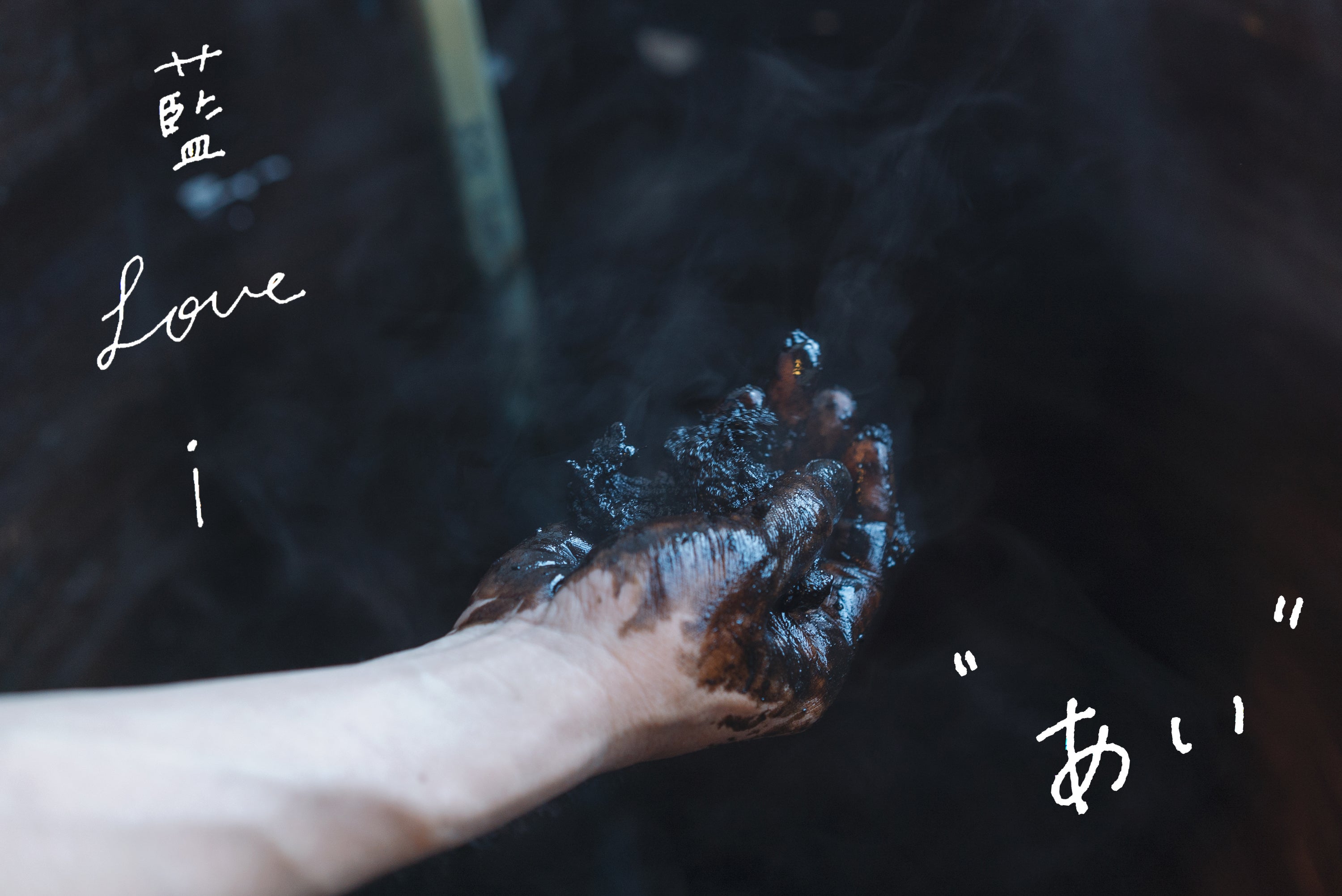本藍は、蓼藍(タデアイ)を収穫し(3〜9月)、藍を発酵させた染料「すくも」を作り(9月〜12月)、藍建て(樫の木などの灰や日本酒などを入れて混ぜ、微生物の働きを活性化させ、ふすまや小麦の皮で糖分を加える)をすることで完成します。