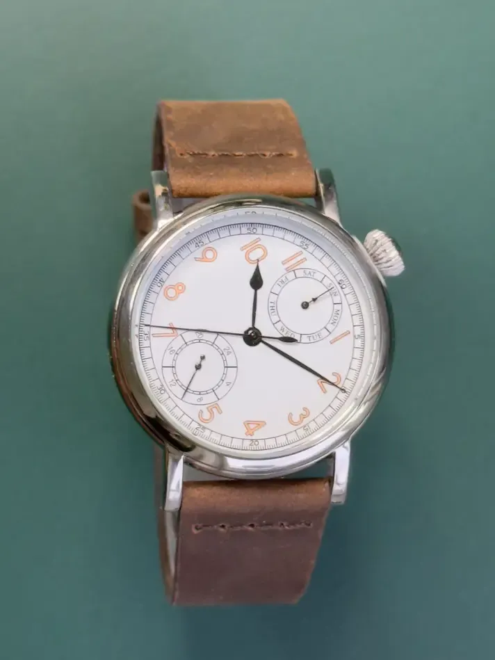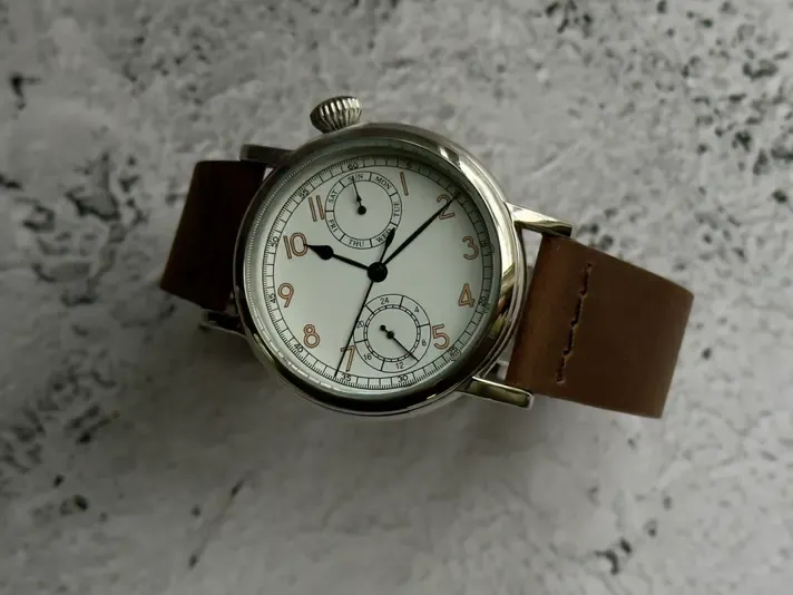 前記にある通りオリジナルケースは49mm〜51mmととても大きいです。文字盤のデザインのイメージを出来るだけ崩さず、38.5mmに入れ込むのはとても大変な作業でありました。また機能を24時間と曜日表記に変更し、オリジナルの雰囲気を維持するにはトライアンドエラーの連続でした。