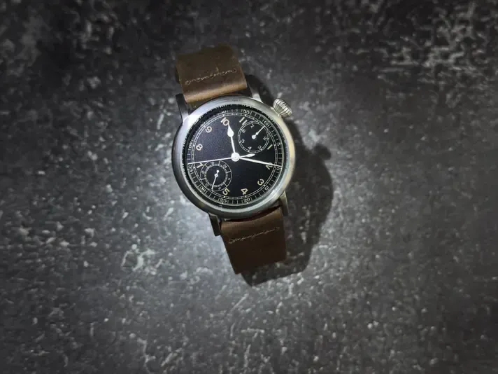 タイプ A-7 アヴィエーションハックウォッチ は、1930 年代にロンジンとメイランが製造し、米国陸軍航空隊USAAF(United States Army Air Forces)に配給されたパイロットウォッチに基づいています。ミリタリーウォッチの教科書とも言える本の表紙にも使われているマニア憧れのモデルです。