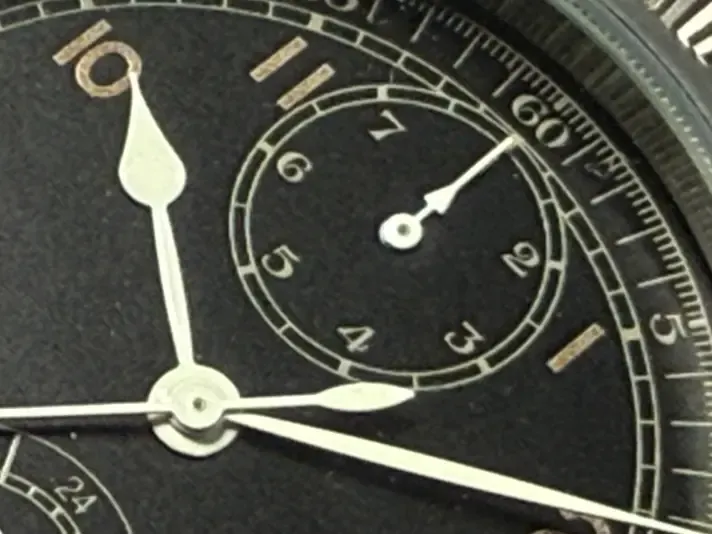 オリジナルノTYPE A-7が1834年10月に調達された時点ではホワイト文字盤でした。1940年にミルスペックに則り、以降はブラック文字盤になりました。スイスに実在したAR&J.E.MEYLAN社の文字盤をオマージュしています。6時位置には24時間時計を配しました。