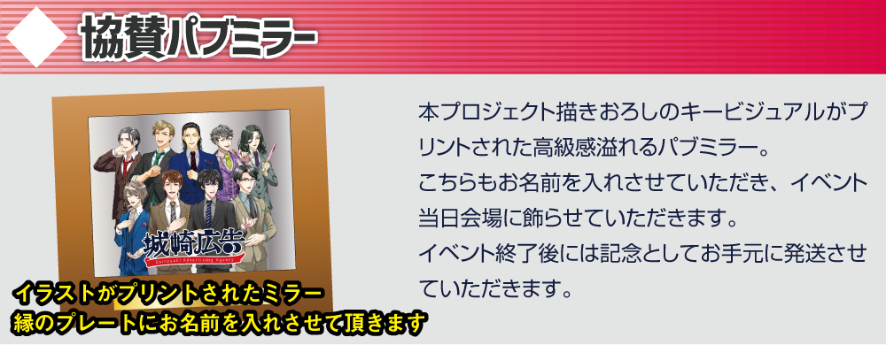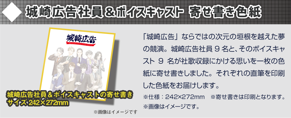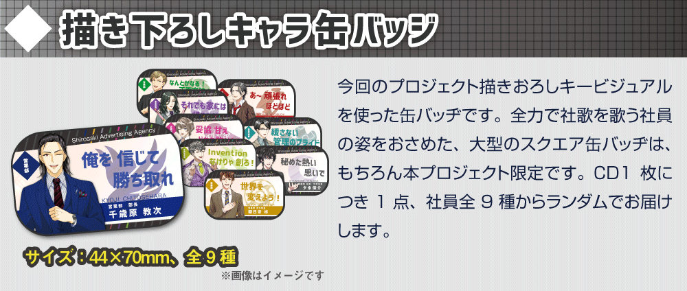 2019/02/18 19:51長らく待たせてしまったが、ついにリターン品を発送する手はずが整った。これから順次、チアリング社員の皆の手元にも届くことと思う。城崎広告にとっても最長にして最大のプロジェクトとなったこの社歌制作プロジェクトに、多くのチアリング社員の支援を受けられたことに改めて礼を言わせてほしい。心から感謝している。完成した社歌を活かして、今後ますます城崎広告を発展させていかねばならないと考えている。そのためにも、引き続き共に働けることを期待しているぞ。様々なことがあったプロジェクトだったが、とくに思い出深いのは社歌収録イベントだな。イベントについてはバンダイナムコエンターテインメント公式オウンドメディア「アソビモット」でも取材記事がまとめられているので、改めて目を通してもらえればありがたい。城崎広告の社歌『SYAIN⇄SHINE』収録イベント&新年会の模様をお届け!https://www.bandainamcoent.co.jp/asobimotto/page/shirosakiad_song.html執筆担当:千歳原教次 もっと見るたくさんのご支援ありがとうございました!
