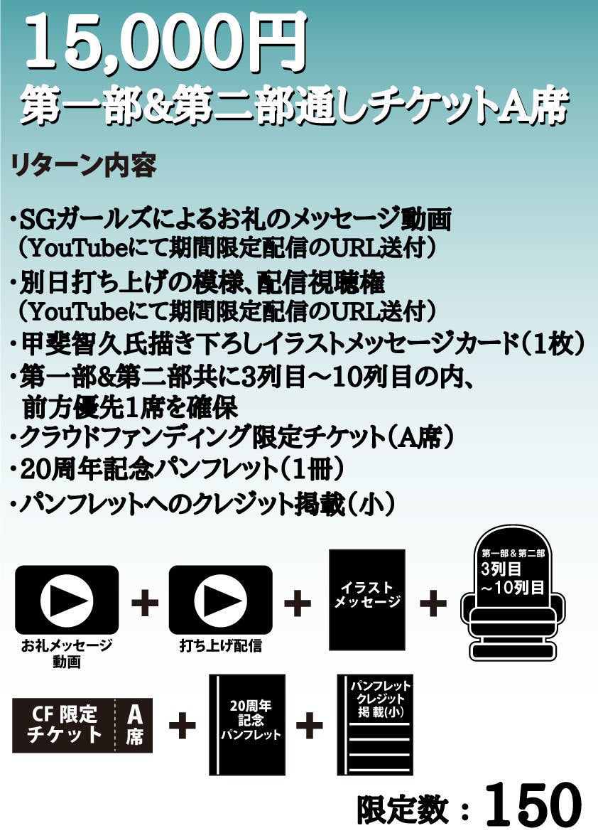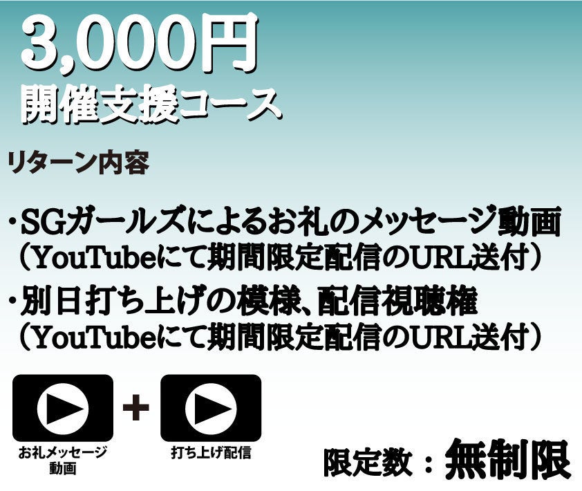 2,000万円:新曲制作、新規オリジナル衣装制作、パンフレットのページ数アップに加えて、当日の模様のDVD映像がカメラ3台、編集ありにアップグレード(開催支援コース、お弁当支援コースを除く。DVDは複数コースご支援の方にもお届けは1枚となります。)