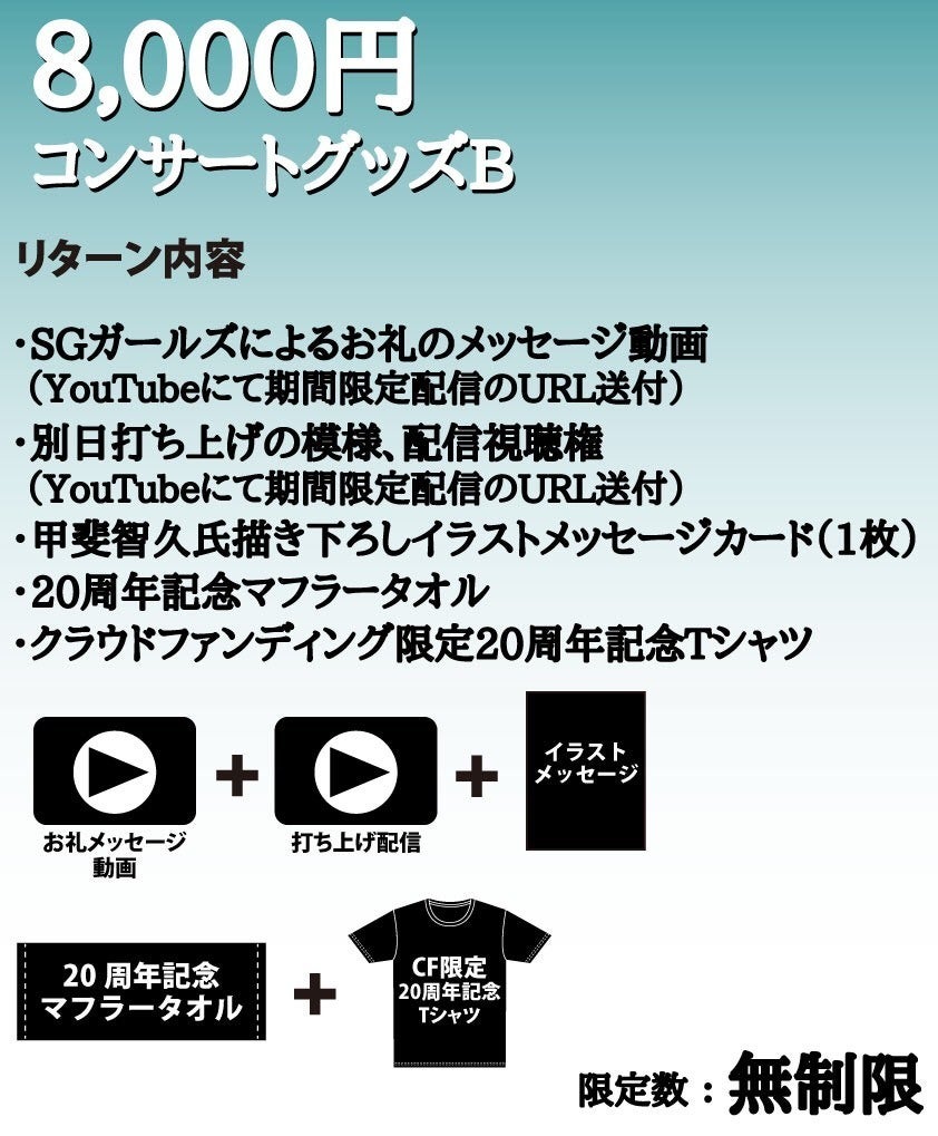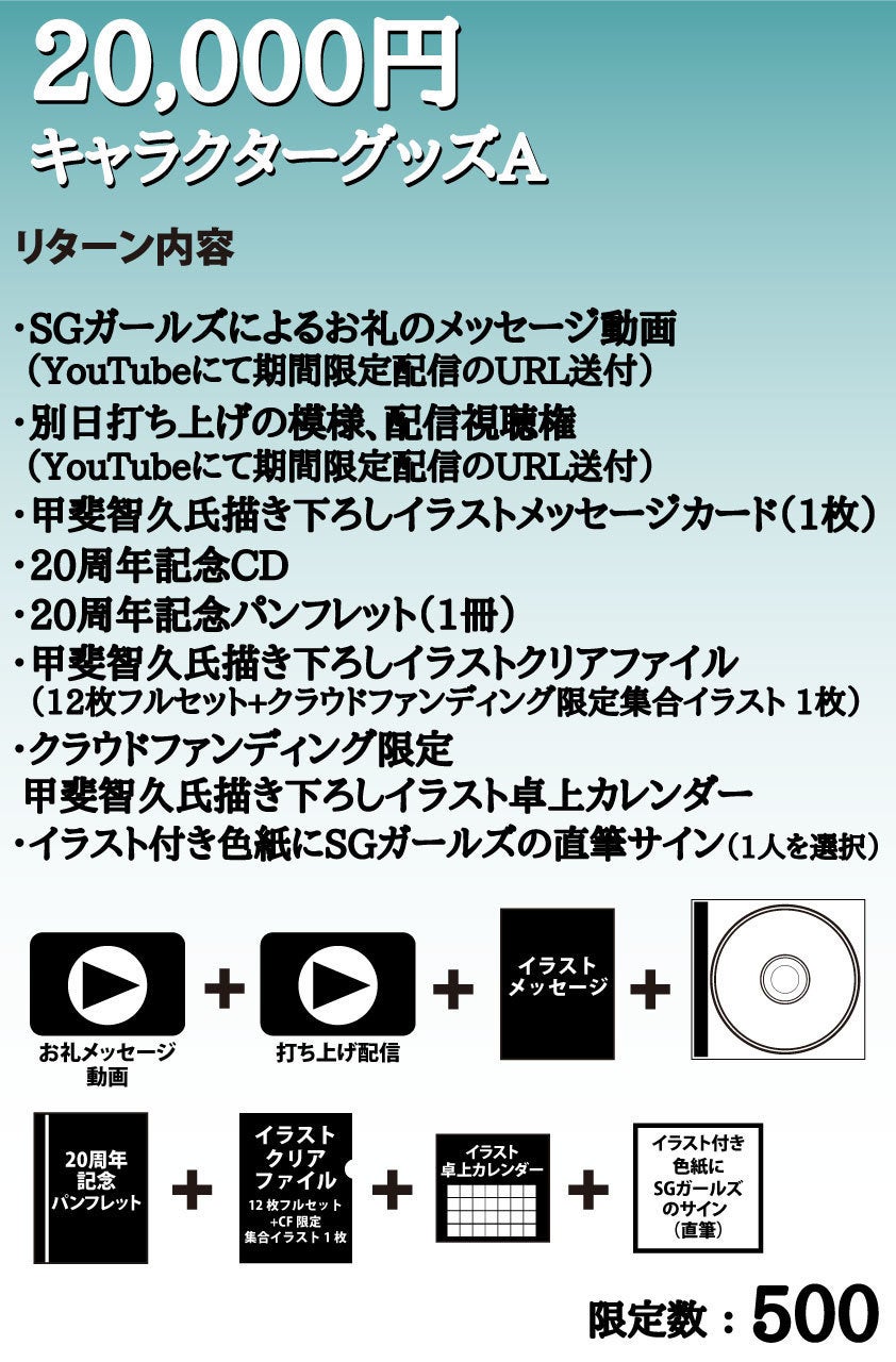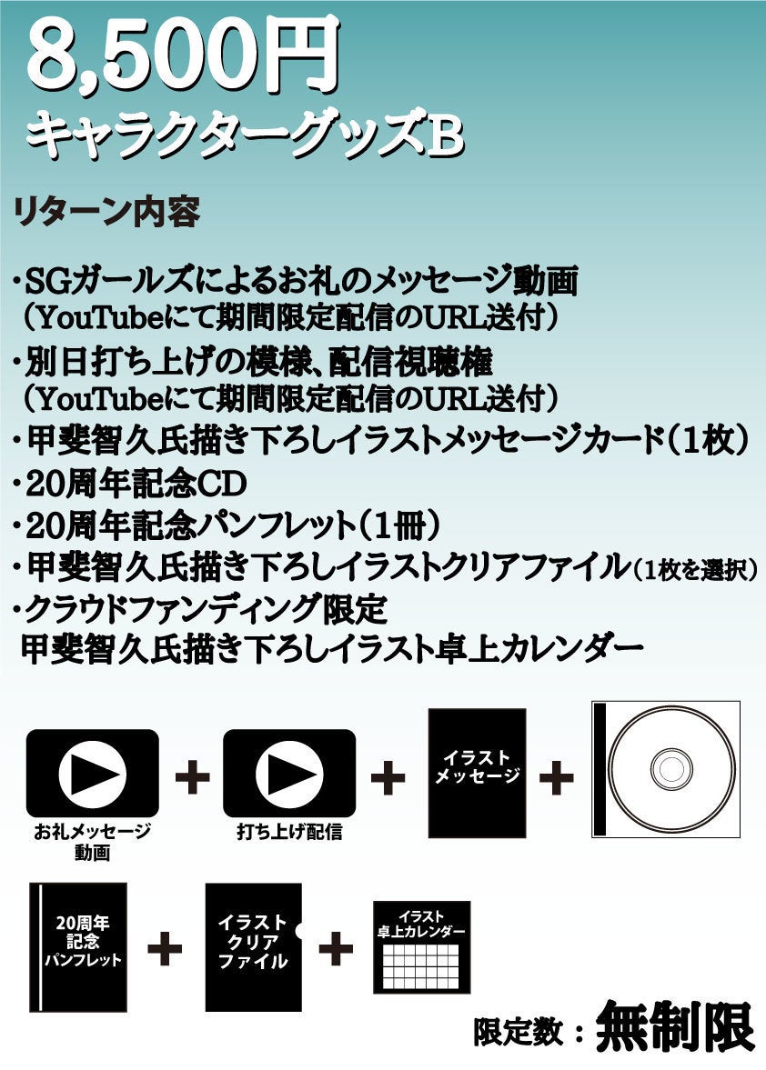 2,500万円:新曲制作、記録映像(編集済み)DVDを支援者さま全員にプレゼント、新規オリジナル衣装制作、パンフレットのページ数アップに加えて、大倉らいた氏シナリオによるオーディオドラマ制作(20周年記念CDに収録)