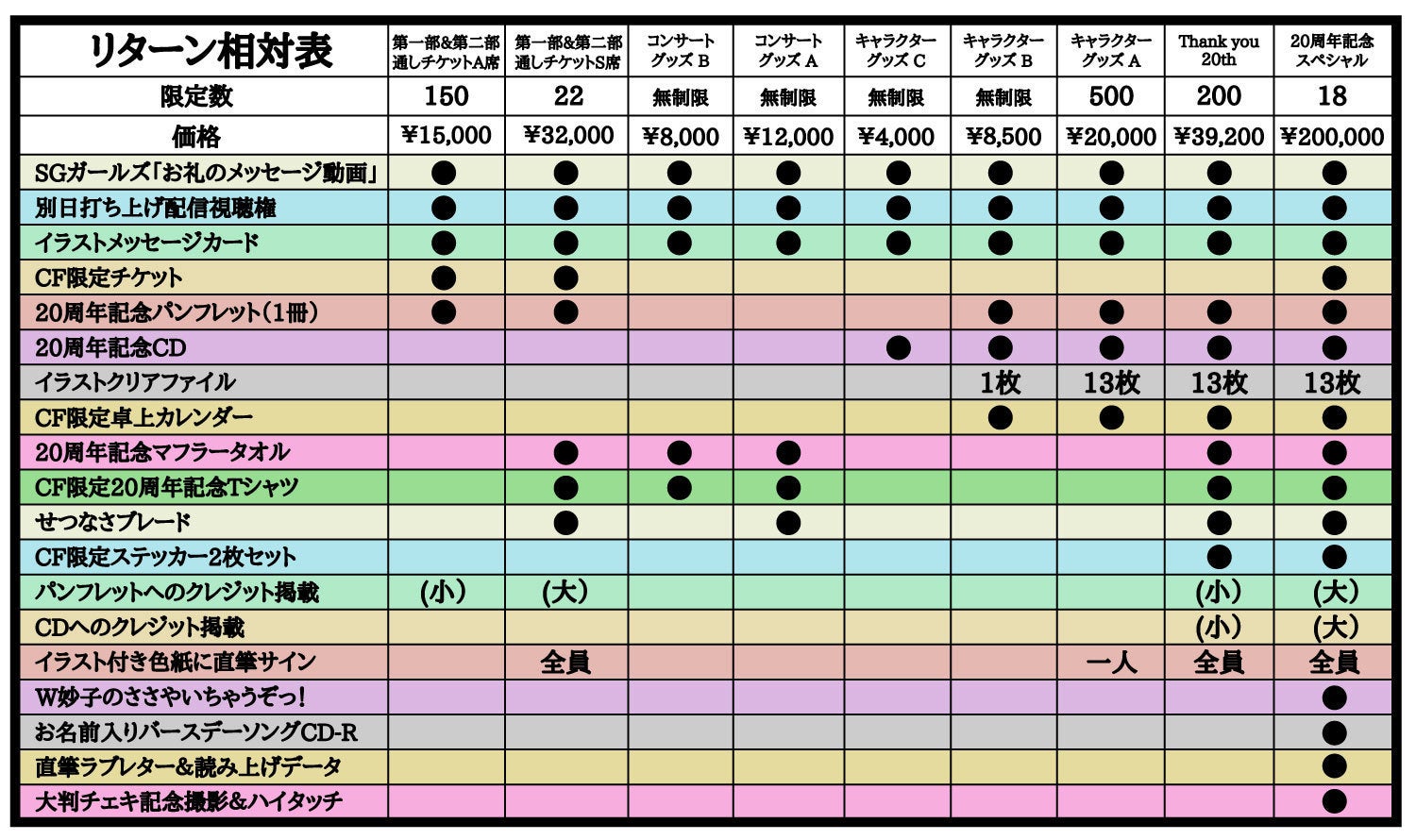 1,800万円:新曲制作、記録映像DVDを支援者さま全員にプレゼントに加えて、新規オリジナル衣装制作と20周年記念パンフレットのページ数アップ(開催支援コース、お弁当支援コースを除く。DVDは複数コースご支援の方にもお届けは1枚となります。)