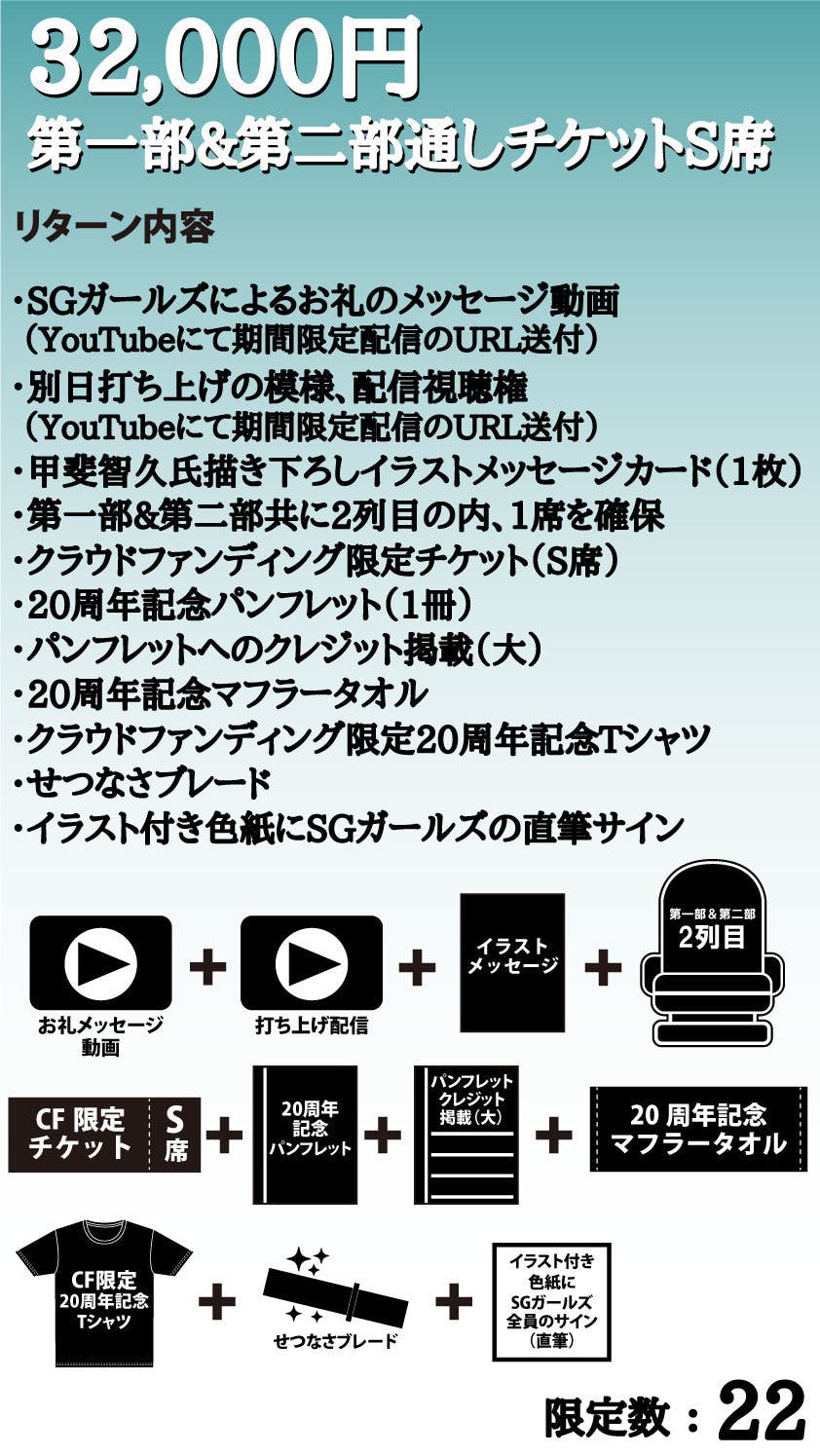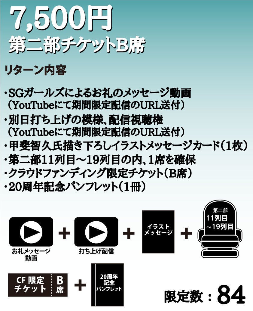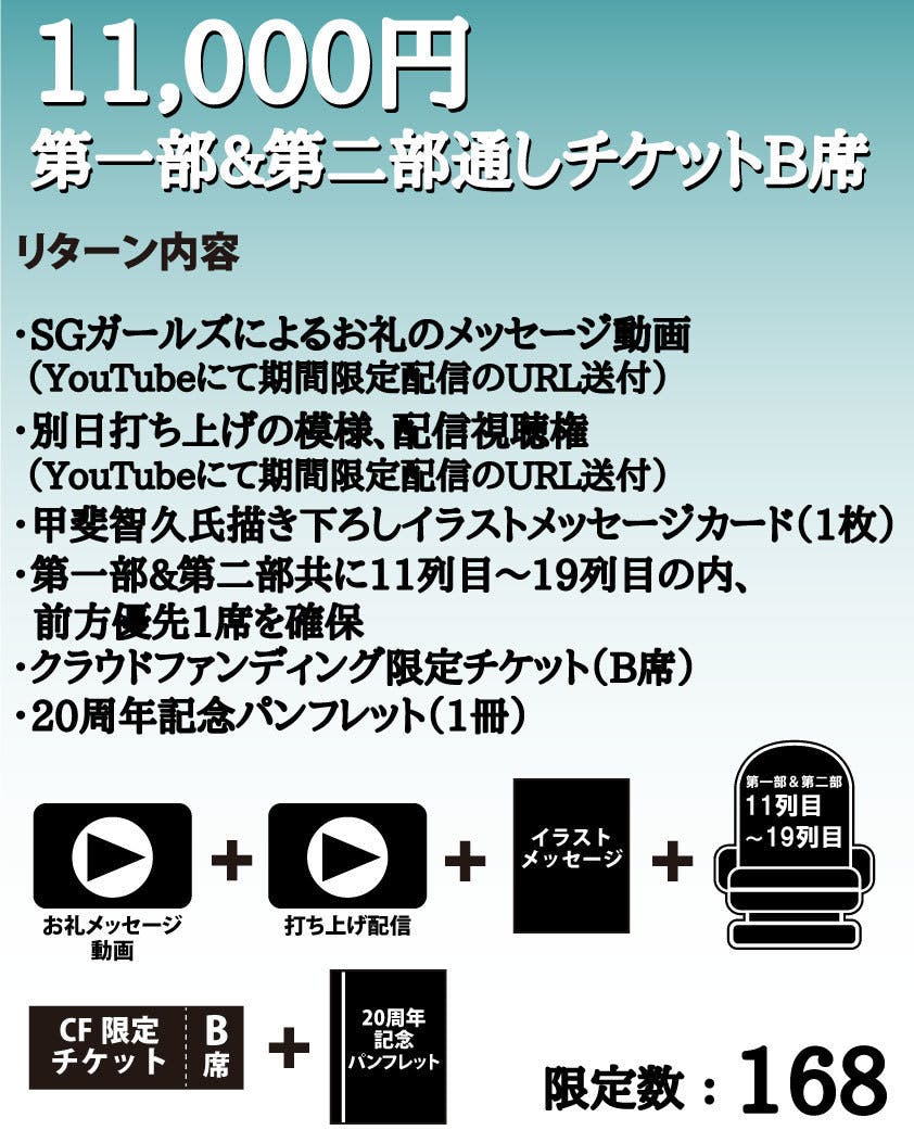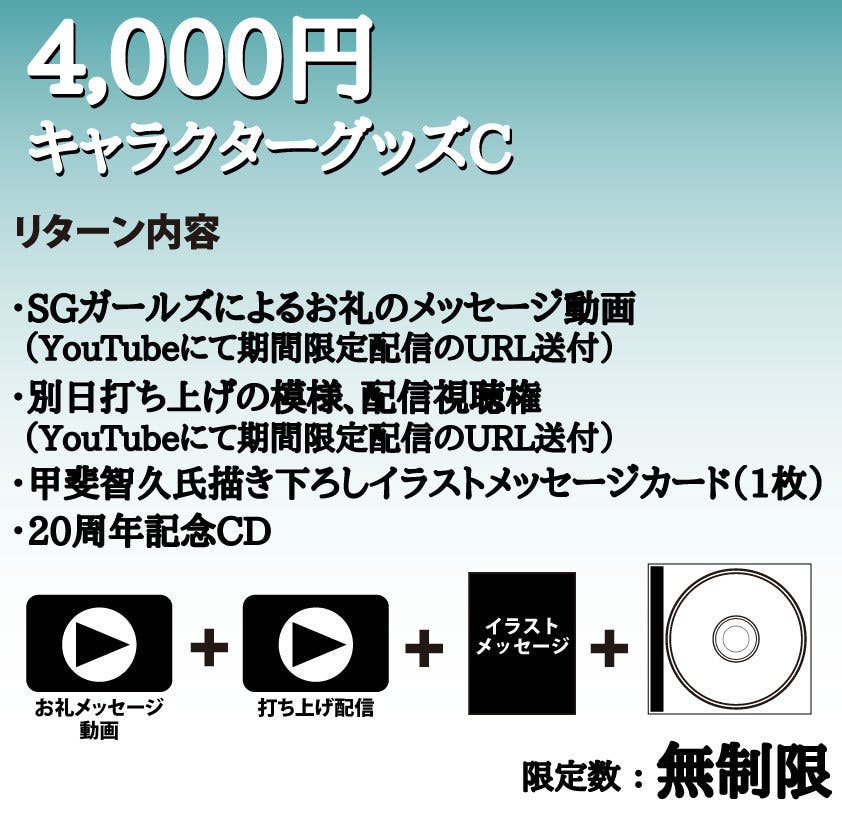 2,500万円:新曲制作、記録映像(編集済み)DVDを支援者さま全員にプレゼント、新規オリジナル衣装制作、パンフレットのページ数アップに加えて、大倉らいた氏シナリオによるオーディオドラマ制作(20周年記念CDに収録)