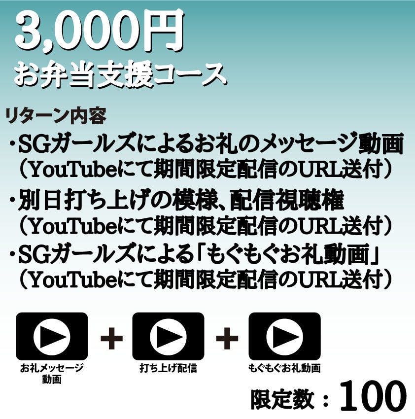 2,000万円:新曲制作、新規オリジナル衣装制作、パンフレットのページ数アップに加えて、当日の模様のDVD映像がカメラ3台、編集ありにアップグレード(開催支援コース、お弁当支援コースを除く。DVDは複数コースご支援の方にもお届けは1枚となります。)