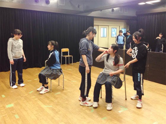 学校の設立メンバーであり演劇部顧問でもあるいしいみちこ先生は、生徒たちが実際体験した事実のテーマでエチュード(即興劇)を繰り返し、稽古し作品を構築してきました。