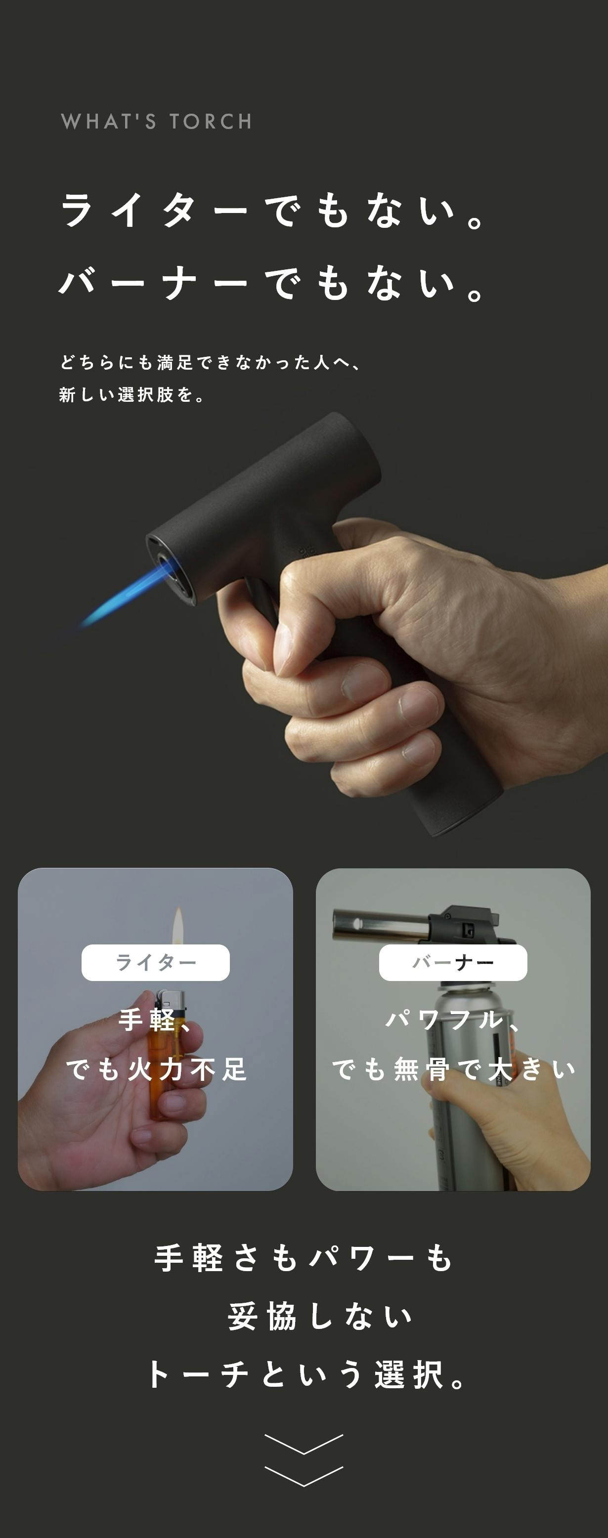 今回のT Torch(ティートーチ)はガスバーナーとライターの良いとこ取りのような製品で、日常はもちろんキャンプなどにも活用できる汎用性が高いのも特徴です。