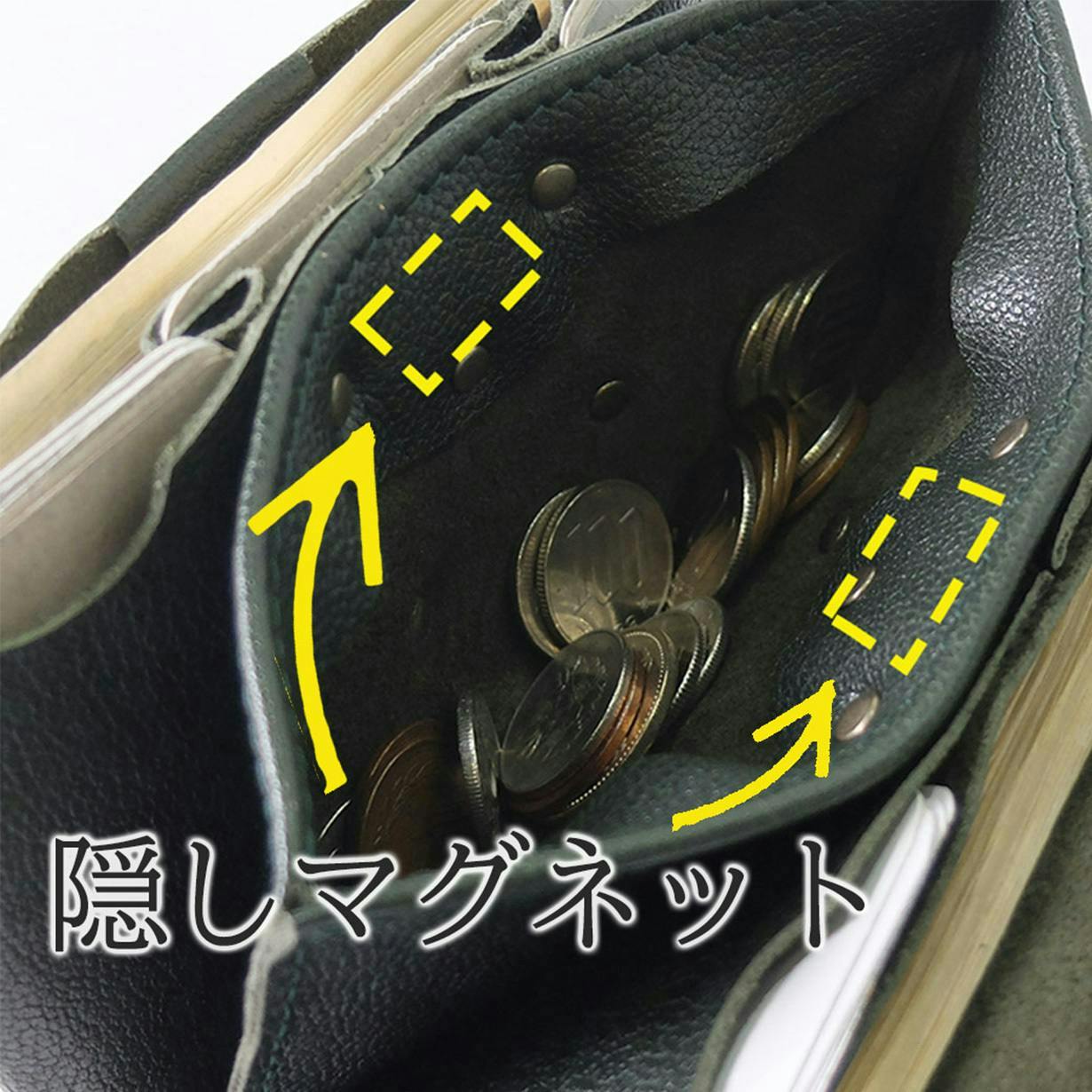 隠しマグネットが小銭開口部をしっかりホールド。逆さまにして小銭が落ち心配がありません。