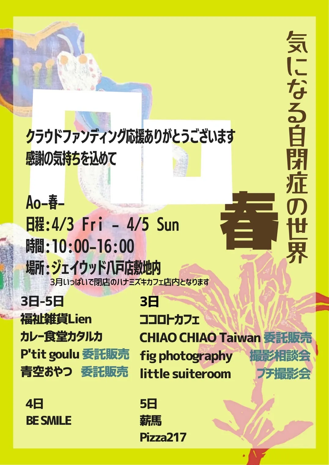 2026/03/25 12:00みなさま、いつも温かい応援を本当にありがとうございます!おかげさまでついに目標金額の150万円を突破しました!プロジェクトはさらなる高みを目指して最後まで走り続けます。この大きな感謝の気持ちを込めて、Aoを応援くださっているお店のみなさんと一緒に春の息吹を感じる4月に特別なイベントを開催することにいたしました。「気になる自閉症の世界」 Ao -春- ◯日時• 4/3(金) 〜 4/5(日)• 10:00 〜 16:00◯場所• ジェイウッド八戸店 敷地内(3月いっぱいで閉店となるハナミズキカフェ店内となります)〇出店者福𧘲雜貨Lienココロトカフェカレー食堂カタルカCHIAO CHIAO TaiwanP'titgoulufig photography撮影相談会青空おやつlittle suiteroom薪馬BE SMILEPizza217※各店舗の出店日は異なります。詳しくは画像をご覧ください。クラウドファンディングは画面を通じた応援が主役ですが、私たちは直接会えることの力を信じています。ネットの画像では伝えきれない、キャンバスに塗り重ねられた絵の具の質感。アーティストたちが一筆一筆に込めた、言葉にならない静かな熱量。そして、彼らを支える家族や仲間。それらに直接触れていただける場所が、今回の「Ao -春-」です。支援という枠組みを一度忘れて、ただ純粋にいいなと思える作品に出会いにいらしてください。会場となるのは、3月で惜しまれつつ閉店するハナミズキカフェさんの店舗です。これまでの感謝を込めて、最後の日々をAoの彩りで満たしたいと思っています。日々応援くださっているお店の方々の料理やパンやお菓子。それにAoのアートに囲まれて、ゆっくりとした時間を過ごしませんか?みなさまとお会いできるその瞬間を、心から楽しみにお待ちしております!気になる自閉症の世界Ao もっと見る