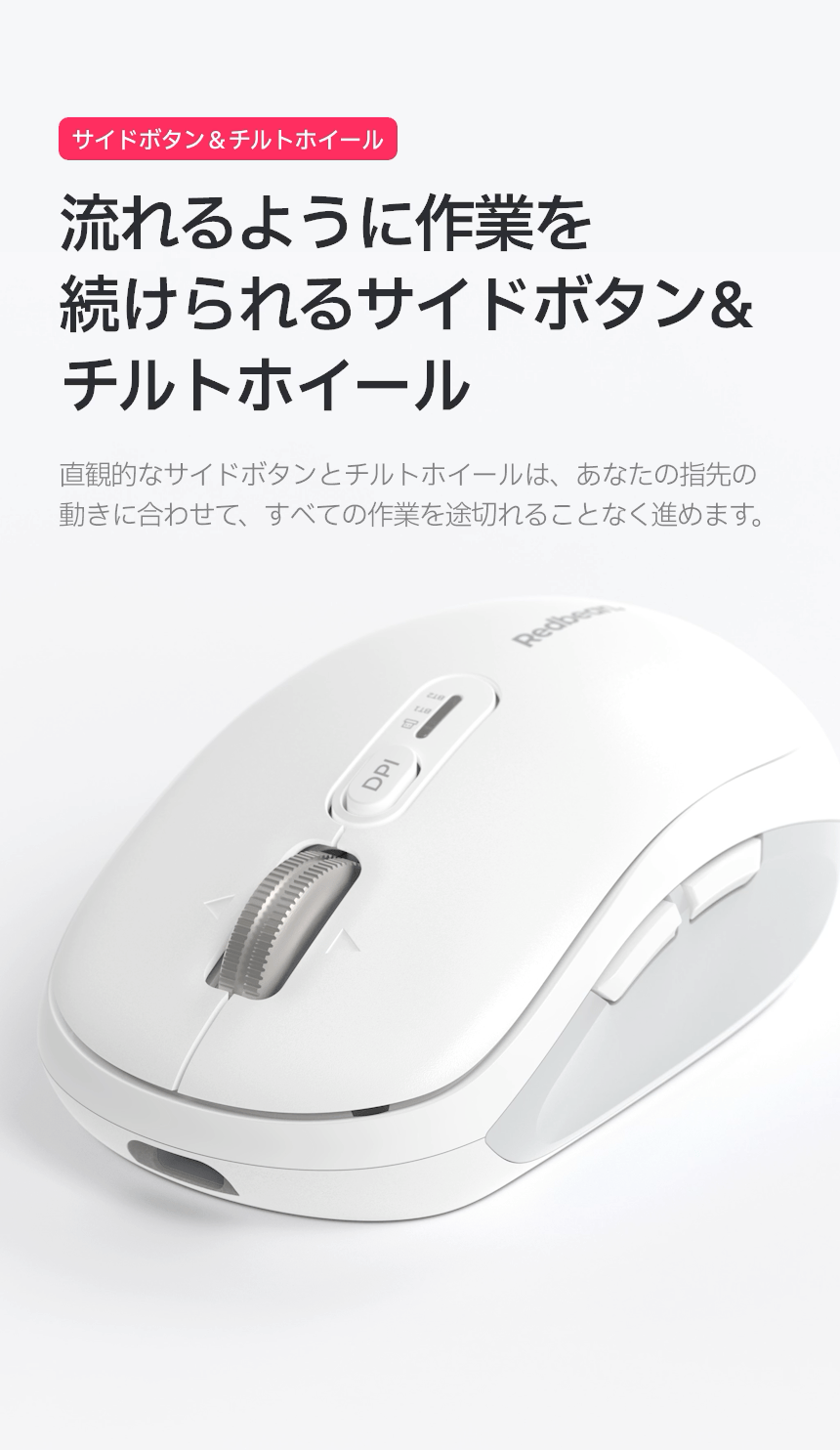 | ホイールからサイドボタンまで全てが静音設計。 カフェやオフィス、図書館でも周囲に気を使わず作業に集中できます。(*チルトホイールの左右移動時は除く。)