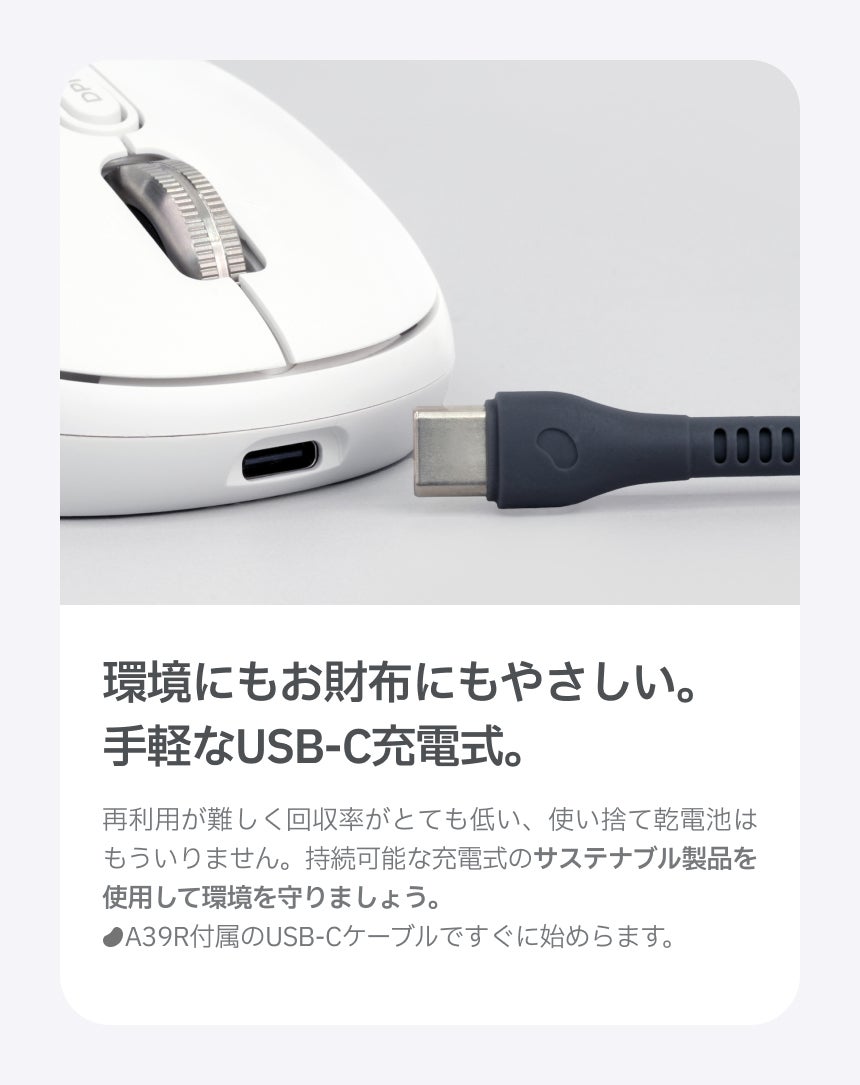 | 乾電池不要で環境にもお財布にもやさしいUSB-C充電式。充電状況はLEDライトでお知らせ。