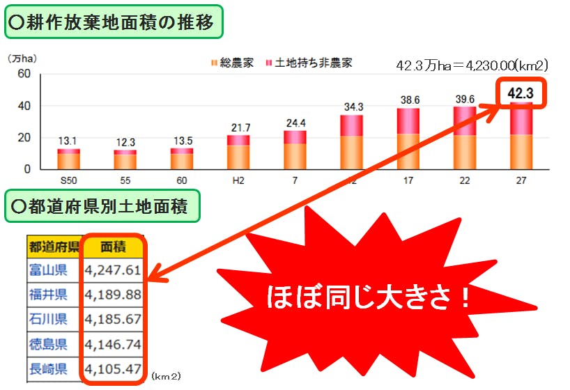 平成29年7月の資料を見ると日本全国の耕作放棄地はなんと42万ha!