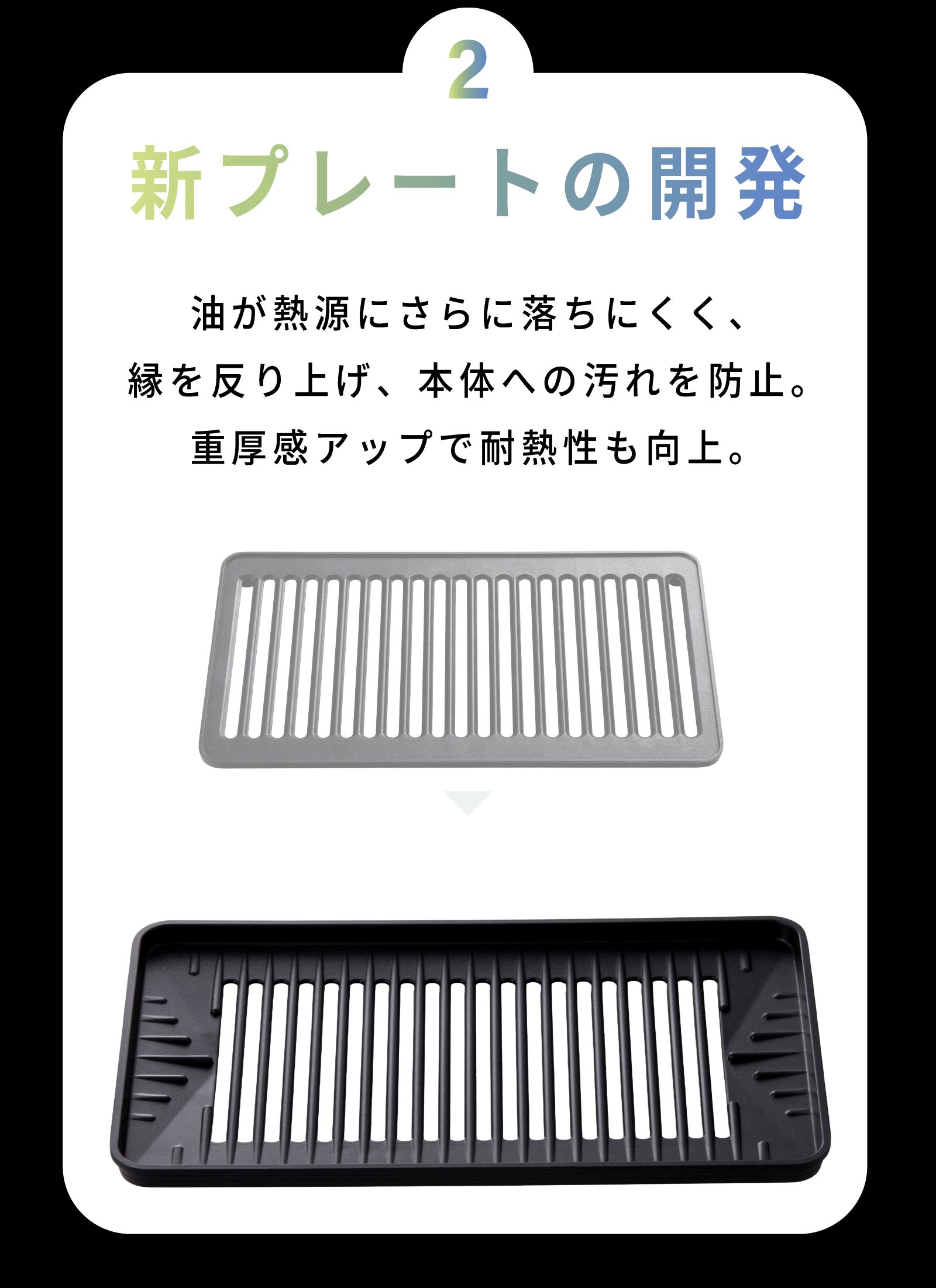 モクモクとした煙を気にせず、家族や仲間と美味しくジューシーな焼肉を自宅で手軽に楽しめる温度調整可能な「超少煙グリル」。独自設計により煙や油ハネを大幅に抑え、室内でも快適に焼肉を楽しめます。さらに、新型プレートを採用することで従来モデルよりも煙が立ちにくくなり、より快適な焼き心地を実現しました。