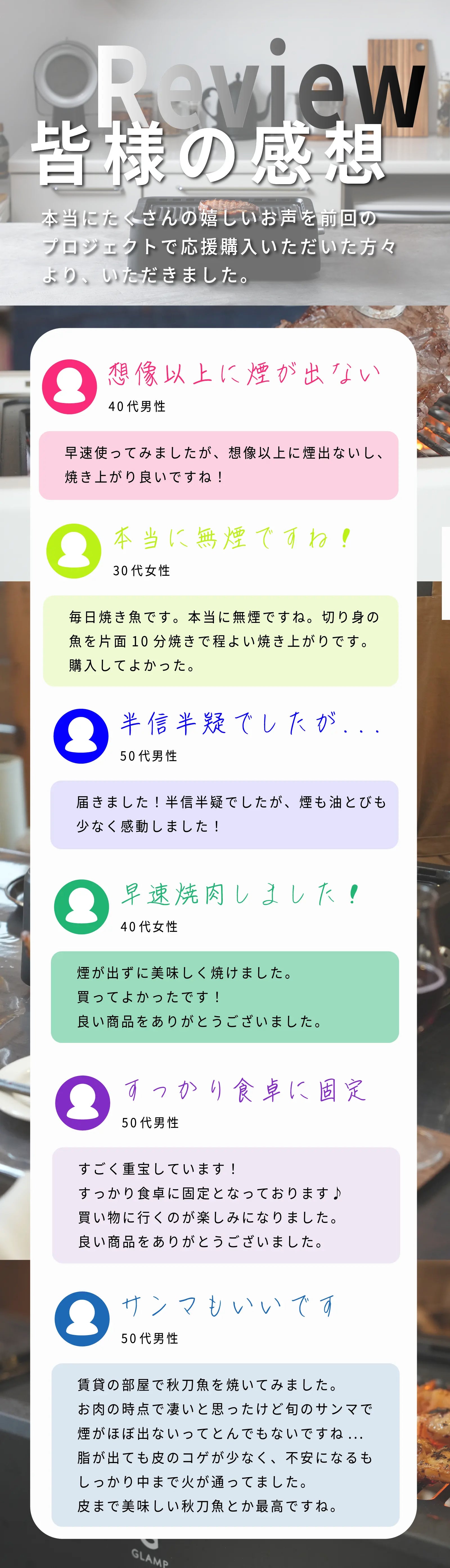そこで、一般リリース前に安価で多くの方々にお届けすべくクラウドファンディングを実施し、まずはGLAMP.の超少煙グリルで快適な焼肉ができることを知っていただきたい!との思いで前回プロジェクトを発足させていただきました。
