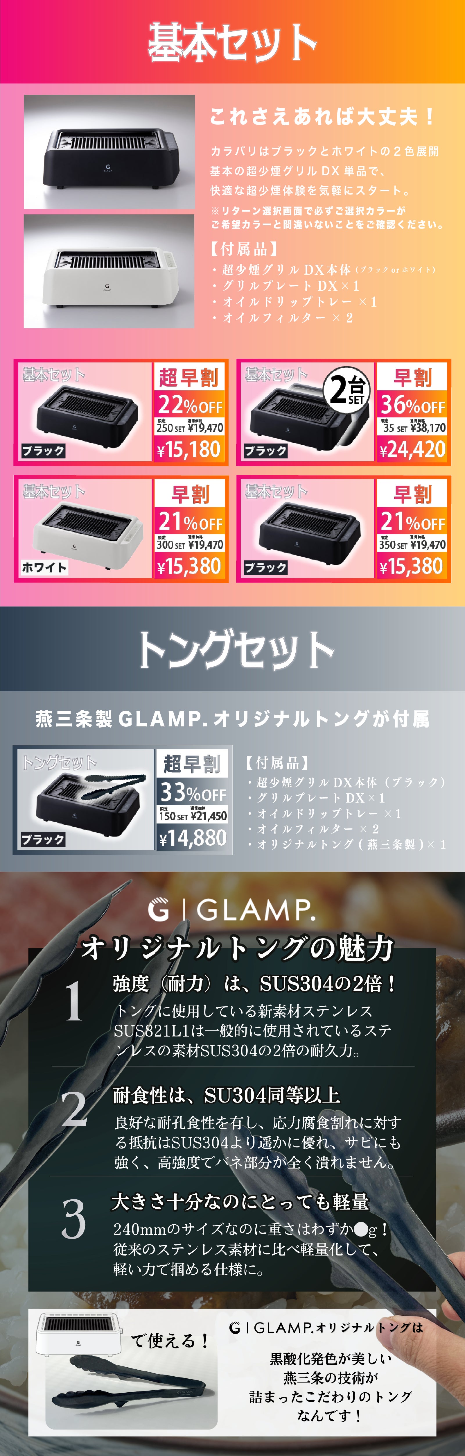 「GLAMP.超少煙グリル」は株式会社LIMONが保有する商標となります。