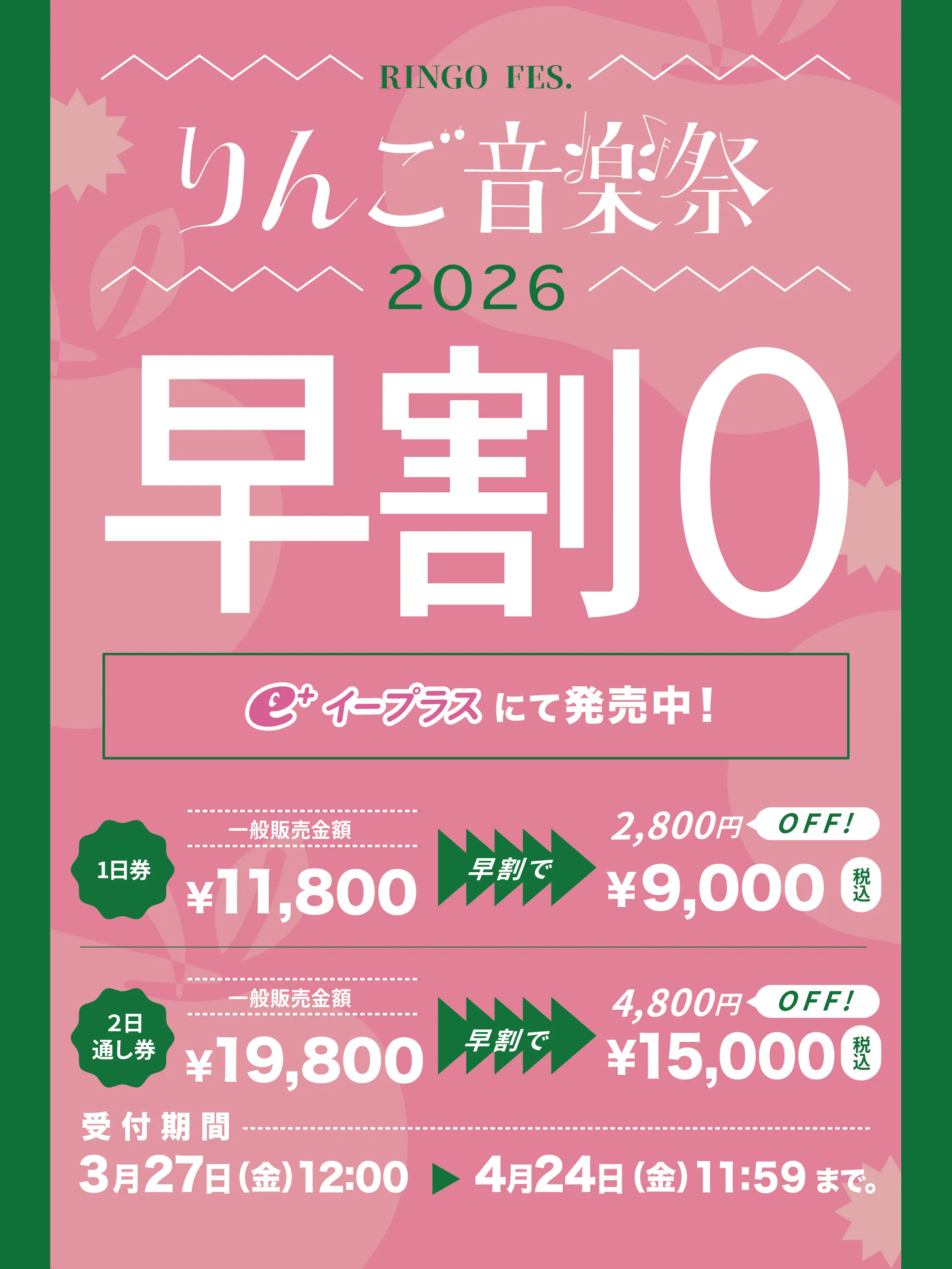 2026/03/19 12:002026年9月26日(土)〜27日(日)の2日間、長野県松本市アルプス公園にて野外音楽フェス「りんご音楽祭2026」の開催が決定!フェスの継続をかけて実施したクラウドファンディングでは、609名の方々からご支援をいただき、目標金額360万円に対し約624万円(達成率173%)を集めることができました。皆さまの応援を力に、2026年の開催が決定しました。改めて、心より御礼申し上げます。本日3月19日より、e+にて最安値となる【早割0】チケットの松本市民先行販売を開始しました。松本市民の皆さまはぜひこの機会にチケットをご購入ください。通し券・1日券のほか、オートキャンプ券・休憩広場券・駐車券も同時に発売を開始します。【早割0】チケットは、今年度最もお得にりんご音楽祭へご参加いただけるチケットです。早割0~4、一般発売、当日券と順次価格が上がります。最安値でのご購入はこの機会をお見逃しなく!▽【早割0】松本市民先行受付早割0 通し入場券 ¥15,000早割0 1日入場券 ¥9,000受付期間:3月19日(木)12:00〜3月27日(金)11:59➡チケット購入はこちらから!『りんご音楽祭2026』日程:9月26日(土)・27日(日)※雨天決行・荒天中止開場9:00/開演10:00/閉演20:30/閉場21:30会場:アルプス公園(〒390-0861 長野県松本市蟻ケ崎2455番地) もっと見る「りんご音楽祭2025」ダイジェストムービー公開!