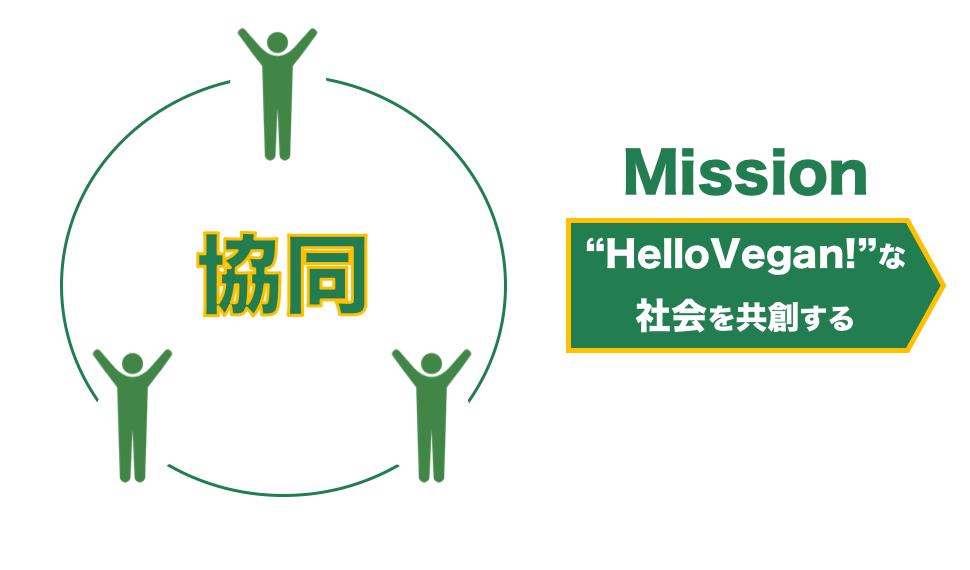 日本ヴィーガンコミュニティのMission(果たすべき使命)は『"Hello Vegan!"な社会の共創』です。