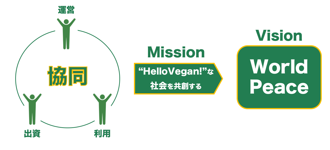 そのためには一人ではなく、志を共にする多くの仲間と、Missionに掲げる『"Hello Vegan!"な社会を共創する』という方向に向かって協同することで、最大の影響力をもって最速でVisionを達成することに繋がると信じています。