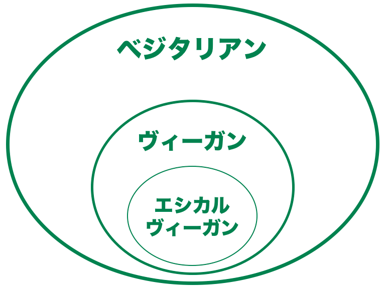 このような食生活での動物性を避けるヴィーガンをダイエタリーヴィーガンと言います。また食べ物だけでなく、革製品や動物実験を行った化粧品などの動物の犠牲を伴う商品の使用も避けるヴィーガンをエシカルヴィーガンと言います。