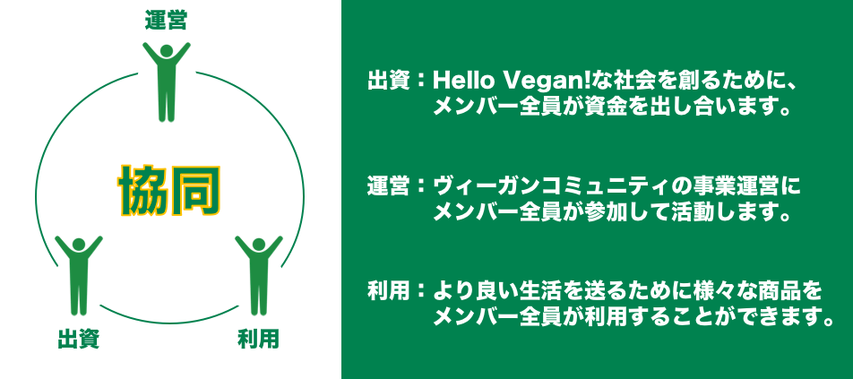 日本ヴィーガンコミュニティは、協同組合モデルのヴィーガンを簡単に楽しく実践できる社会をメンバーと共創する組織です。