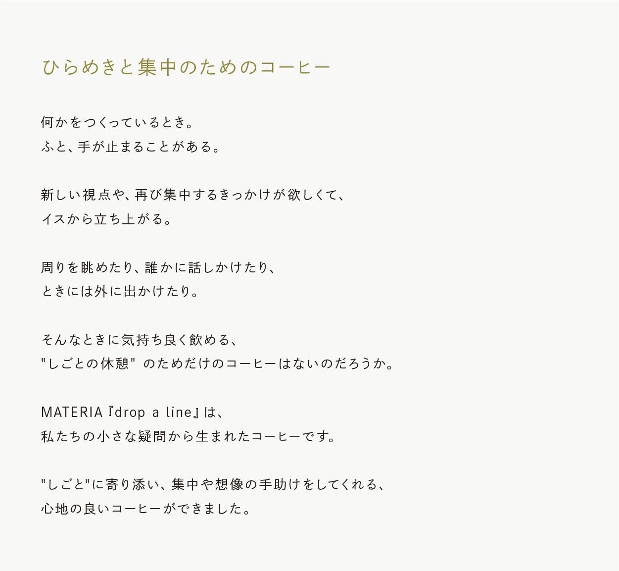 今回のコーヒー『drop a line』は、「MATERIA」の第一弾となるプロダクトです!
