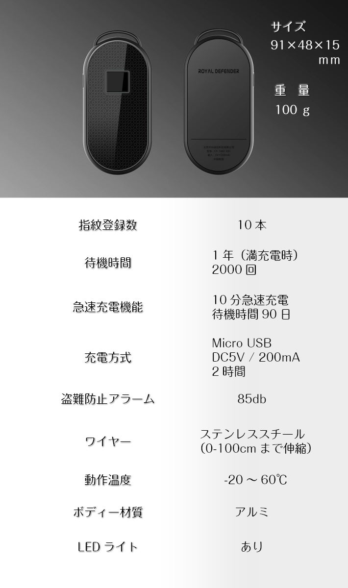 又、他社製品とは違い、不正な操作がされた時やワイヤーをカットされた時には大音量の警報がなります。