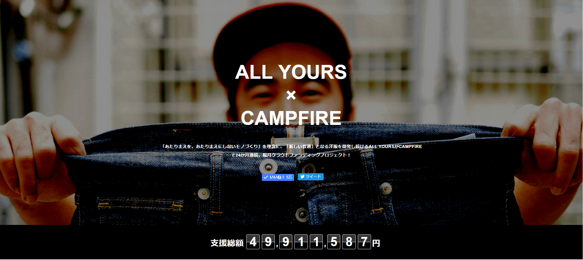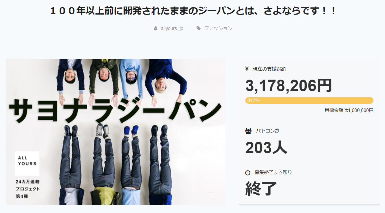 2017年11月~2018年1月にかけて、「100年以上前に開発されたままのジーパンとは、さよならです!!」というプロジェクトを実施し、203人の方から、3,178,206円のご支援を頂きました。本当にありがとうございました。