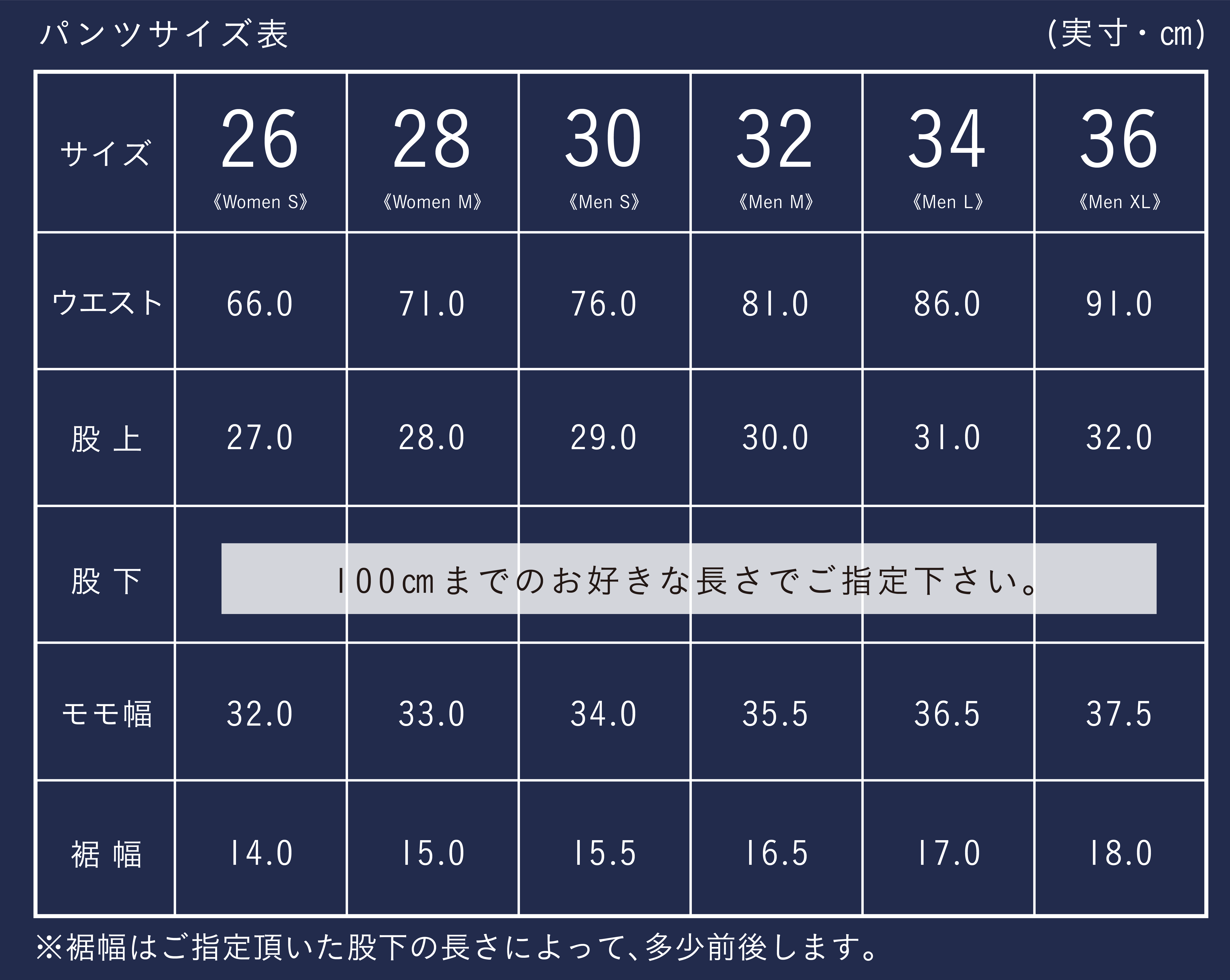 ◎ 股下の長さをご指定できます。56㎝~100㎝まで、2㎝刻みでお好みの長さをご指定頂けます。(ショートパンツにもできます。その場合は指定せずにその他をお選びください。)