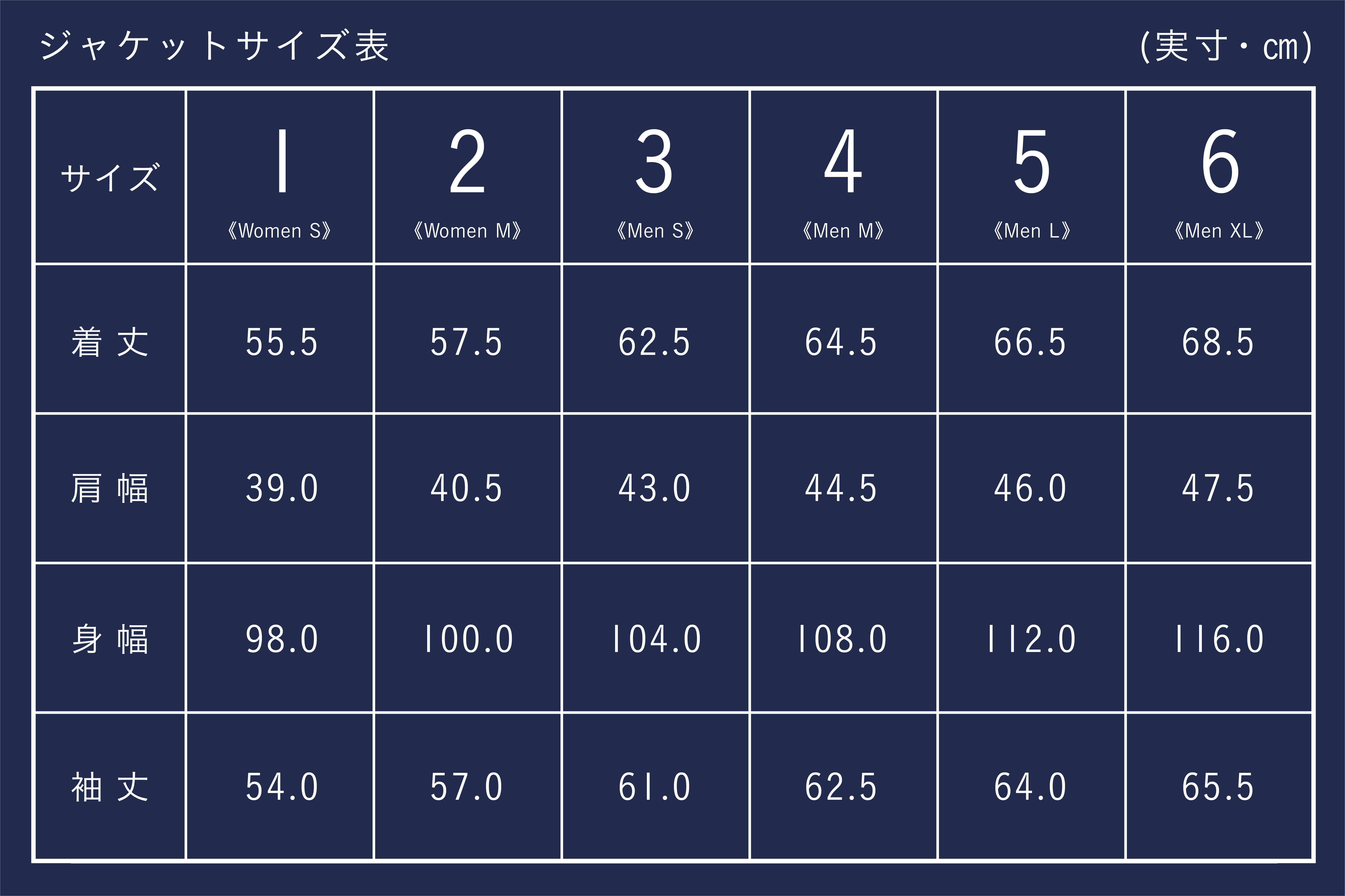 ジャケットはサイズ1(レディースSサイズ相当)~サイズ6(メンズXLサイズ相当)の6サイズからお選びいただけます。